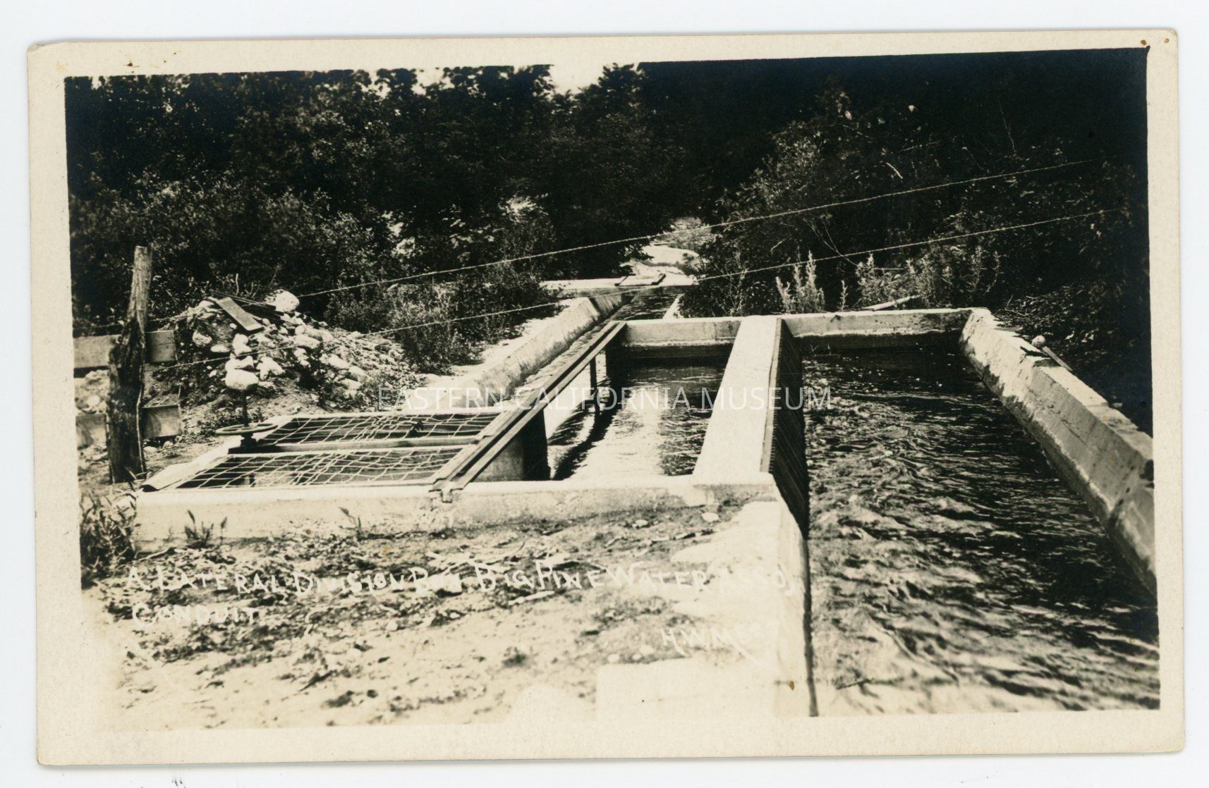 Photo postcard titled, "A Lateral Division Box, Big Pine Water Asso. Conduit" taken by photographer H. W. Mendenhall and given his ID #507 (?).Photograph Details