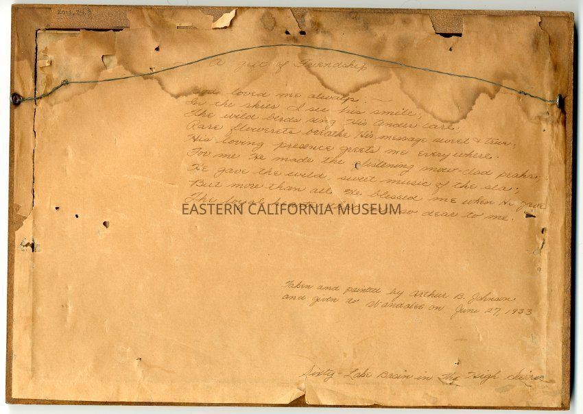 Written on reverse is a poem titled "A Gift of Friendship." Also "Taken and painted by Arthur B. Johnson and given to Wandalee on June 27, 1933." Also "Sixty-Lake Basin in the High Sierra."Collection