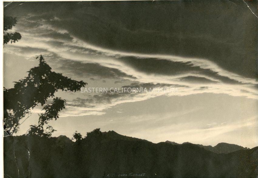Oversize photograph of a sunset with clouds, branches, and mountains. It is labeled in white pen or pencil, "A Sierra Sunset." "R1720" written on reverse, so likely a Ramsey photo. There is a tear in the lower left side.