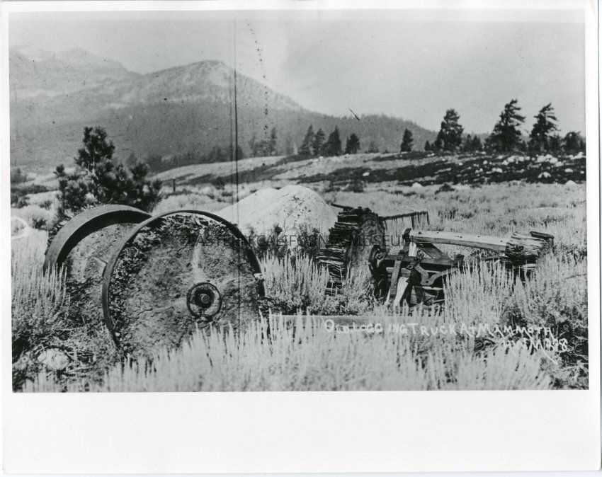 B&W glossy print: old logging truck, Mammoth Mountain in background