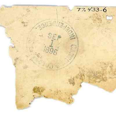 Badly damaged ticket stub, purple or blue in color. It is first class ticket #2961 with a punch. It says, "C&C, V&T, to Virginia & Truckee R.R. Local., Form C. 1, $1925 Agent's Stub. 10-23-93-1000." It is stamped on reverse with "Carson & Colorado R. R., Independence, Sep. 1, 1896."