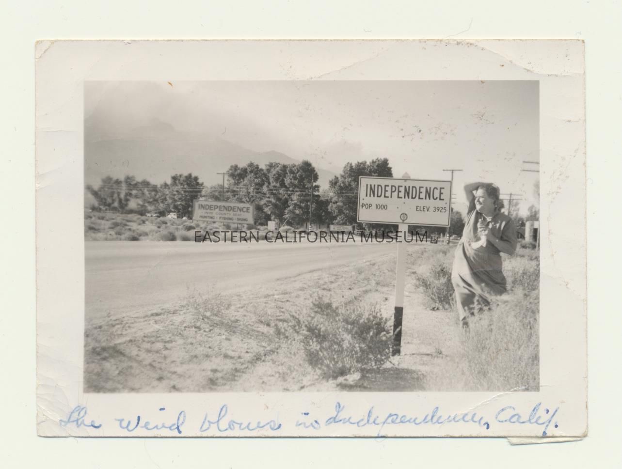 Photo of a woman standing next to the Independence town sign (Population 1,000, elevation 3,925 ft.) while the wind blows her hair and dress. Written in blue ink below image is, "The wind blows in Independence, Calif."Photograph Details