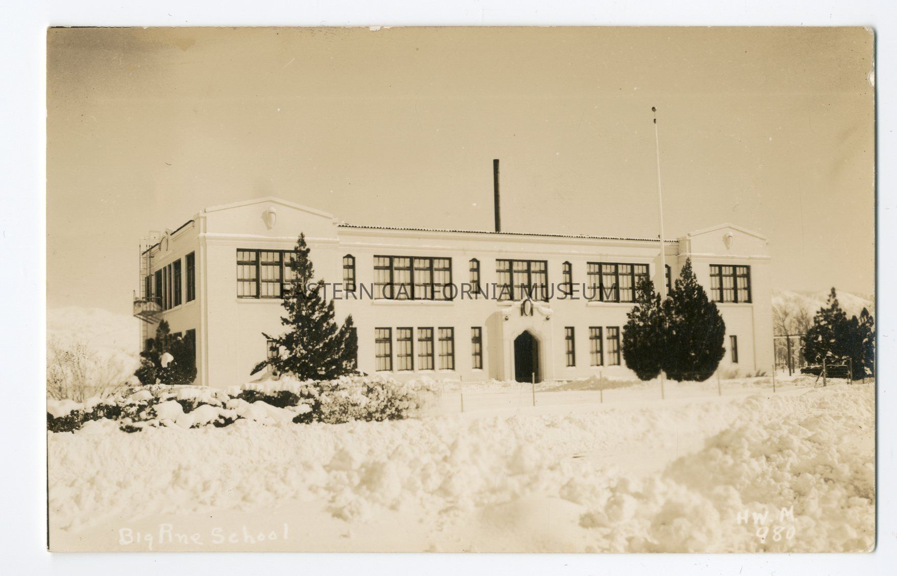 Photo postcard titled, "Big Pine School" taken by photographer Harry Mendenhall and given his ID #980. it shows the "new" two story Big Pine High School building under a heavy blanket of snow.Photograph Details