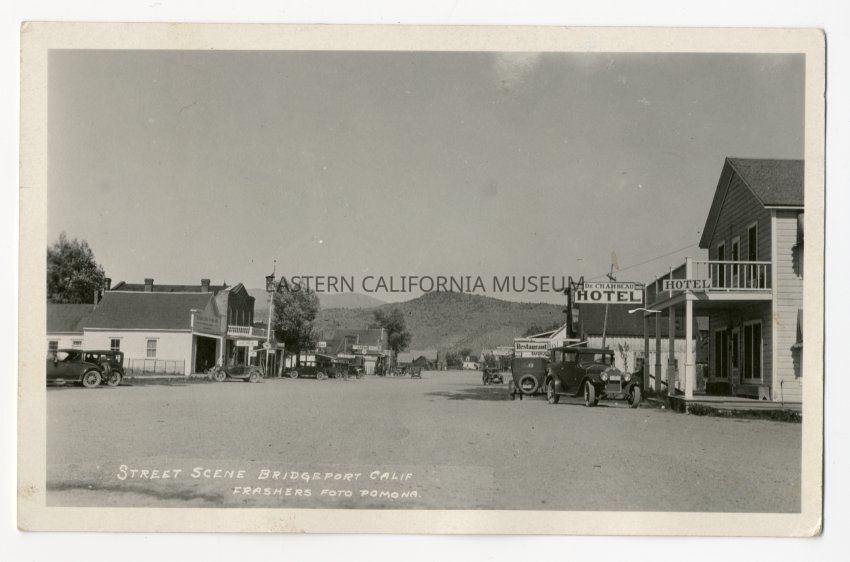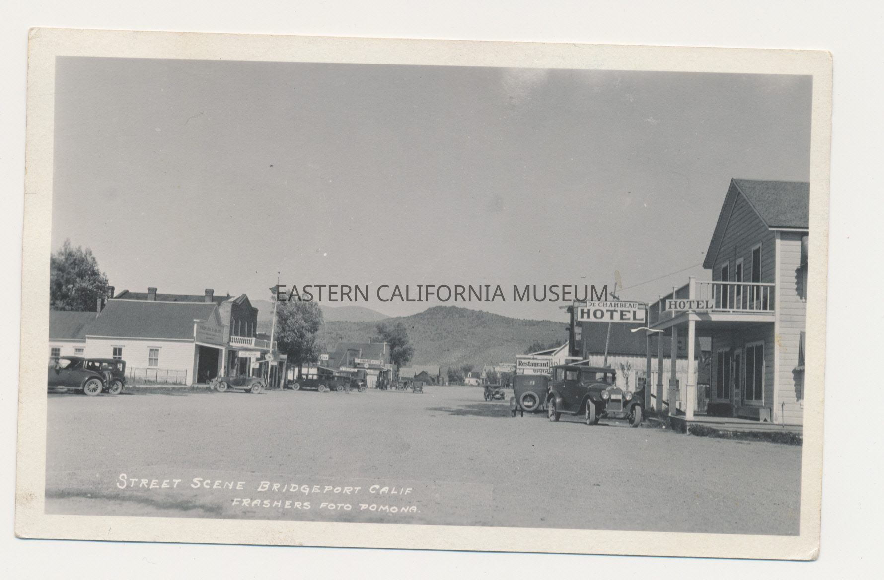 Photo postcard titled, "Street Scene, Bridgeport, Calif." taken by photographer Burton Frasher of Pomona. The De Chambeau Hotel sign is visible on the right.