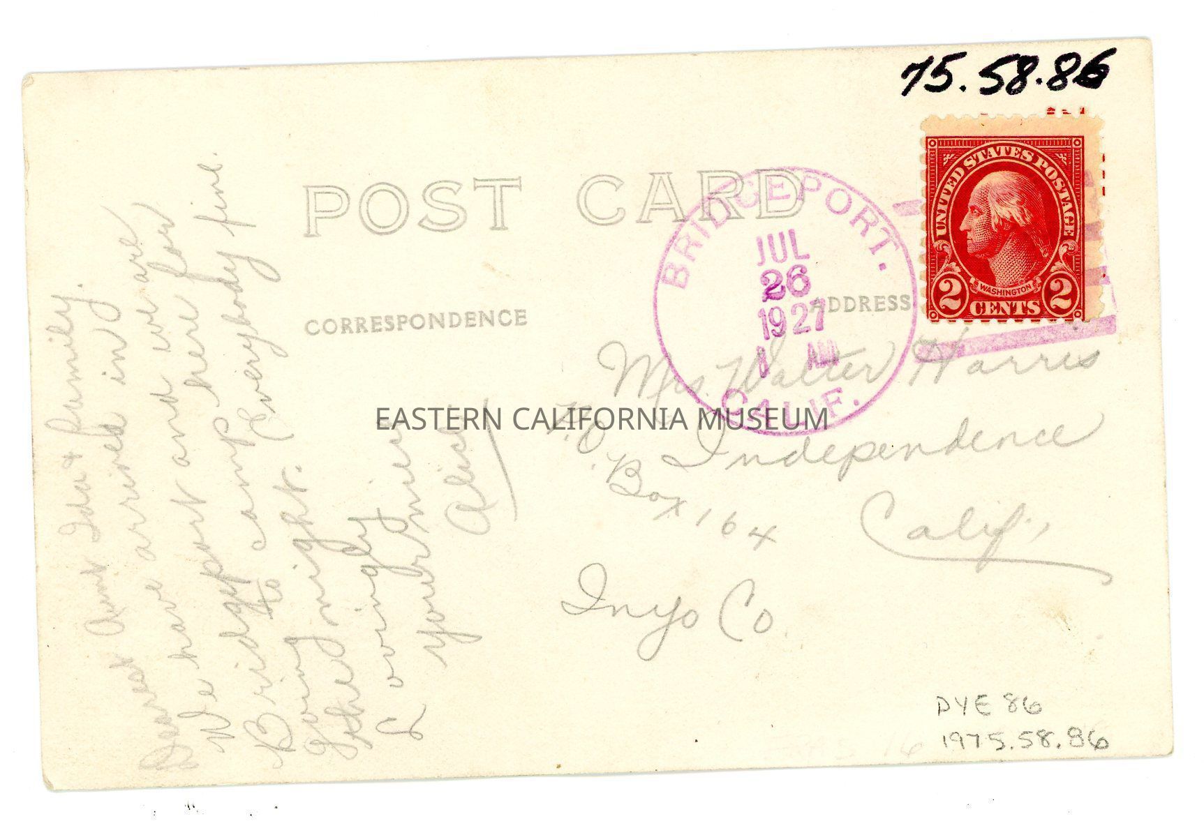 This postcard was written by Alice to her Aunt Ida and family (Walter Harris family) in Independence. Alice was on a camping trip and stayed in Bridgeport overnight. The postmark is July 26, 1927 and the postcard has a two cent red Washington stamp.Collection