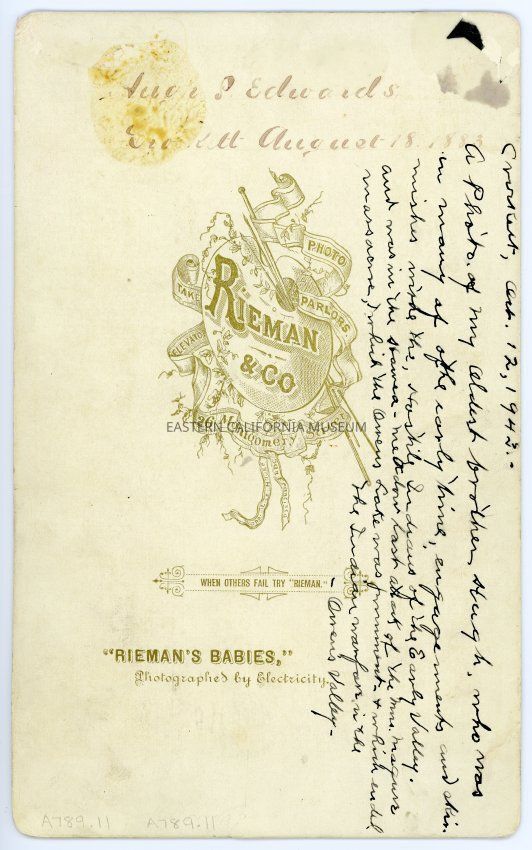 Photograph affixed to card of Hugh P. Edwards, oldest son of Thomas Edwards, wearing an elaborate uniform, feathered hat, sash, and holding a sword. Possibly a Masonic Lodge ceremonial uniform? Photo by Rieman and Co. of San Francisco.