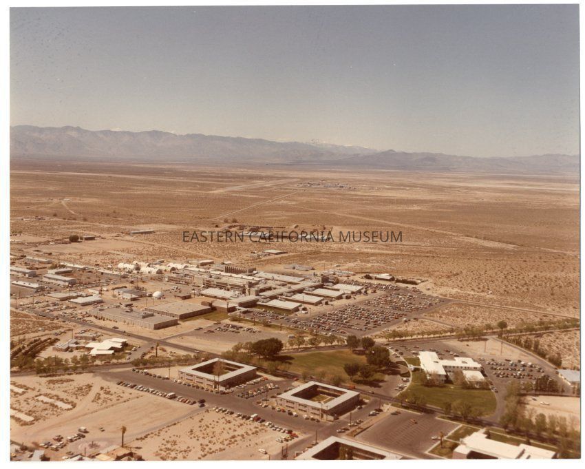 Color print of an aeriel (or at least from a high vantage) shot of a town in the middle of the brown desert. It is likely Ridgecrest or the Naval Weapons Center at China Lake. Mountains visible in distance.Collection
