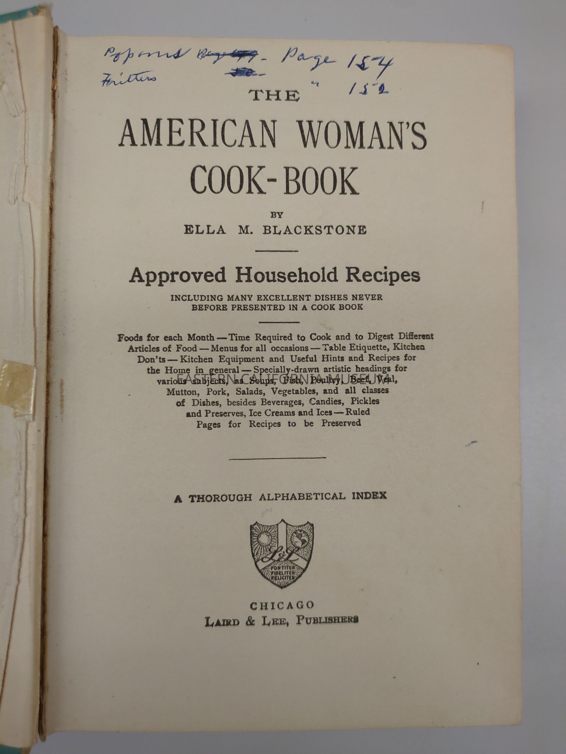 The American Woman's Cook-Book has a few notes in ink on the title page. The front flyleaf is deatched.Collection