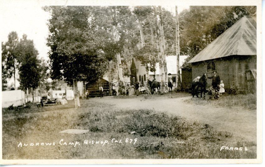 Photo postcard titled, "Andrews Camp, Bishop, Cal." Forbes photo #879.