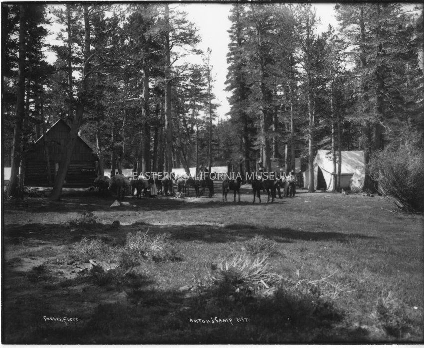 B&W glossy print: number of horseback riders and pack animals in camp setting