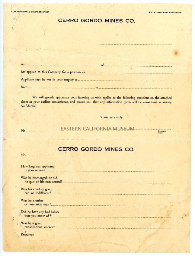 Blank employment application for the Cerro Gordo Mines Co. L. D. Gordon, General Manager and J. C. Climo, Superintendent.
