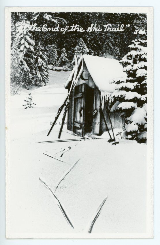 Black and white postcard of an outhouse with skis and poles leaning against it titled, "At the end of the ski trail." Photo by Frasher.Collection