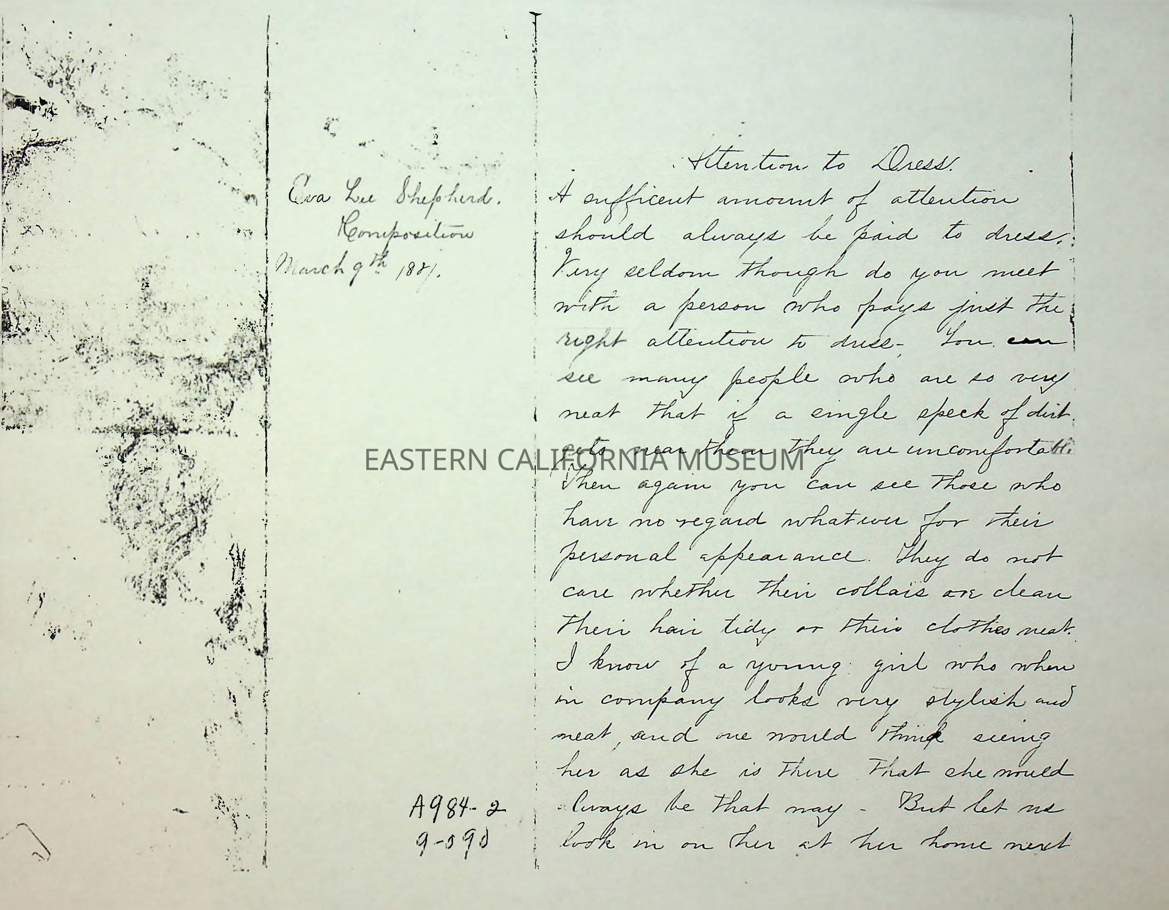 Photocopy of a composition by Eva Lee Shepherd titled, "Attention to Dress" dated March 9, 1881.