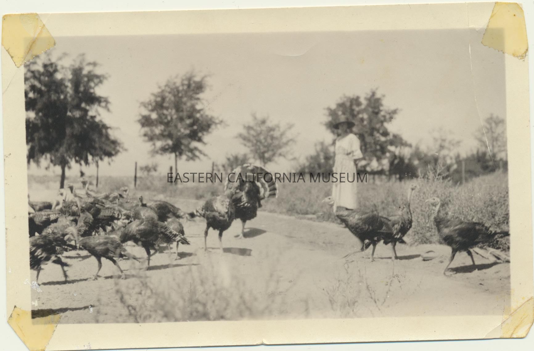 1995.12.34.53a--Group of turkeys with a woman standing behind them.