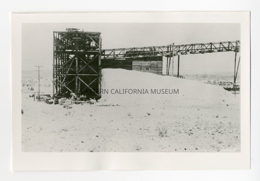 Photo of a Saline Valley Salt Co. station with mound of salt in front of it.Collection