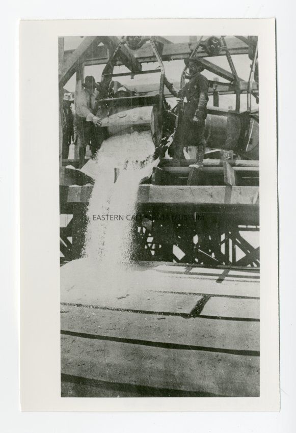 Photo of a man dumping salt out of one of the salt buckets on the Saline Valley Salt Co. aerial tramway.Collection