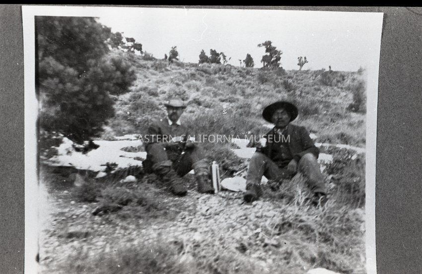 Photo of Johnny Hunter, Shoshone, and an unknown visitor taking a break on a hillside.Collection