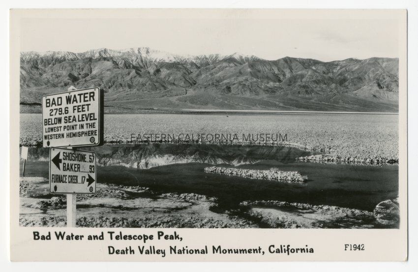 Black and white photo postcard titled, "Bad Water and Telescope Peak, Death Valley National Monument, California." It also has "F1942" on the front. The photo shows the famous sign at Bad Water Basin with a pool of water reflecting the mountains in the distance.