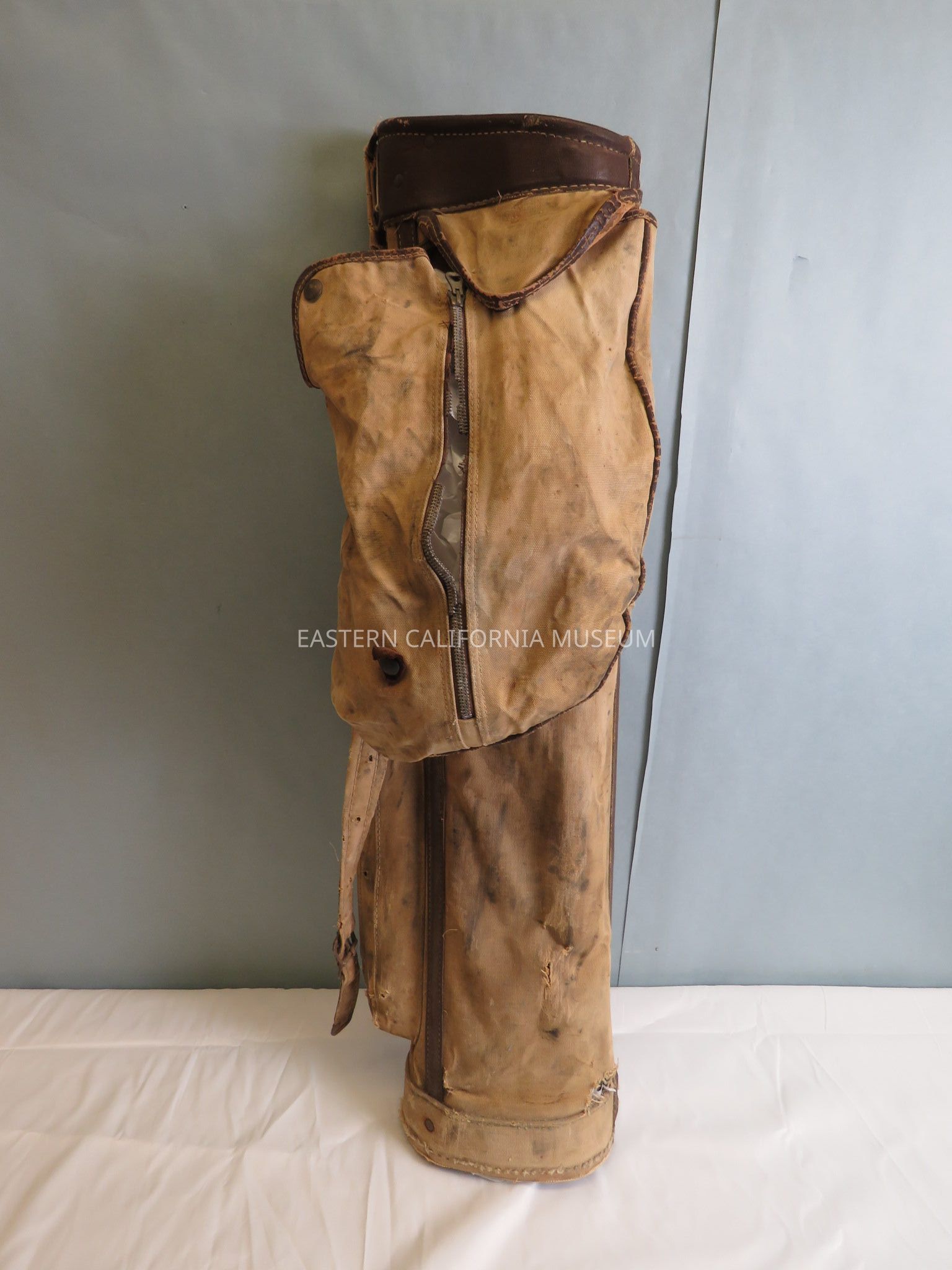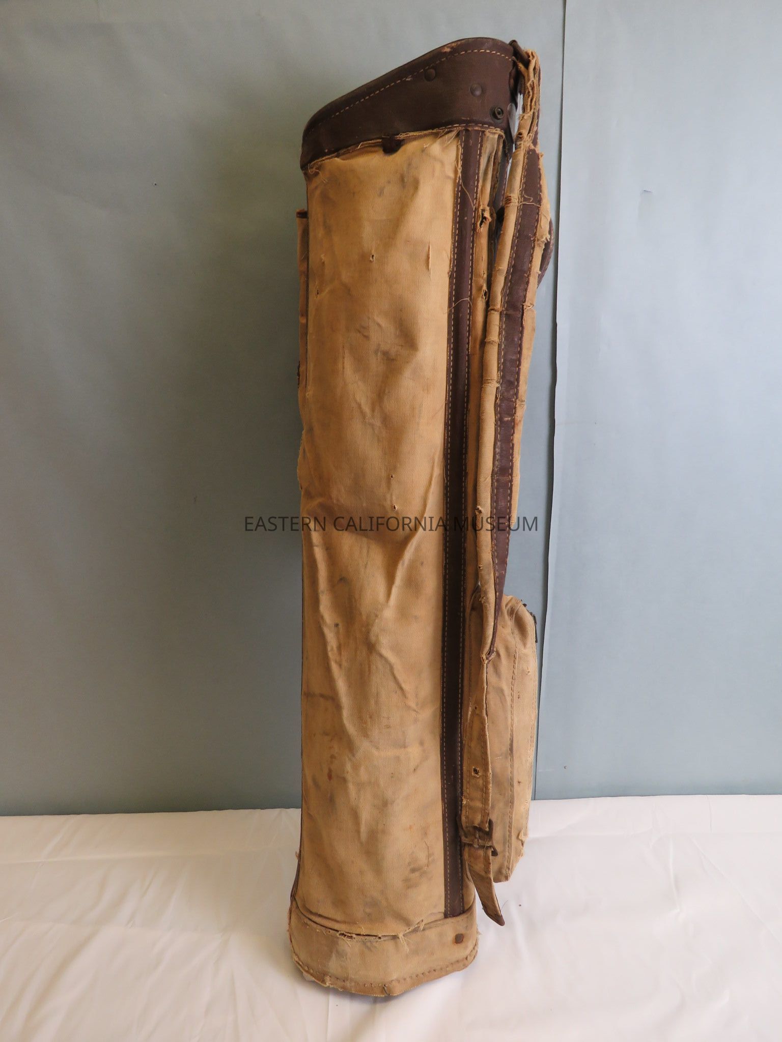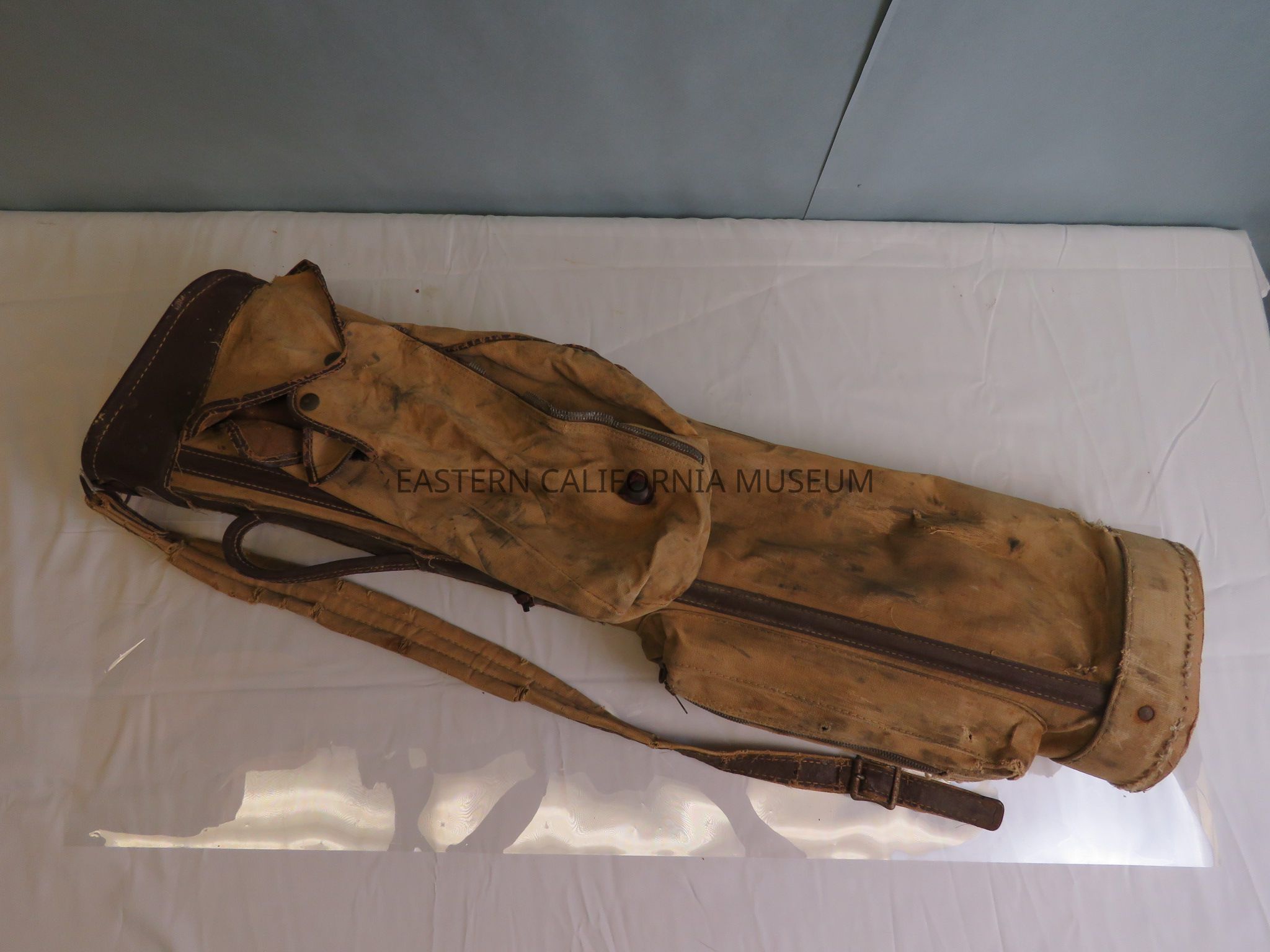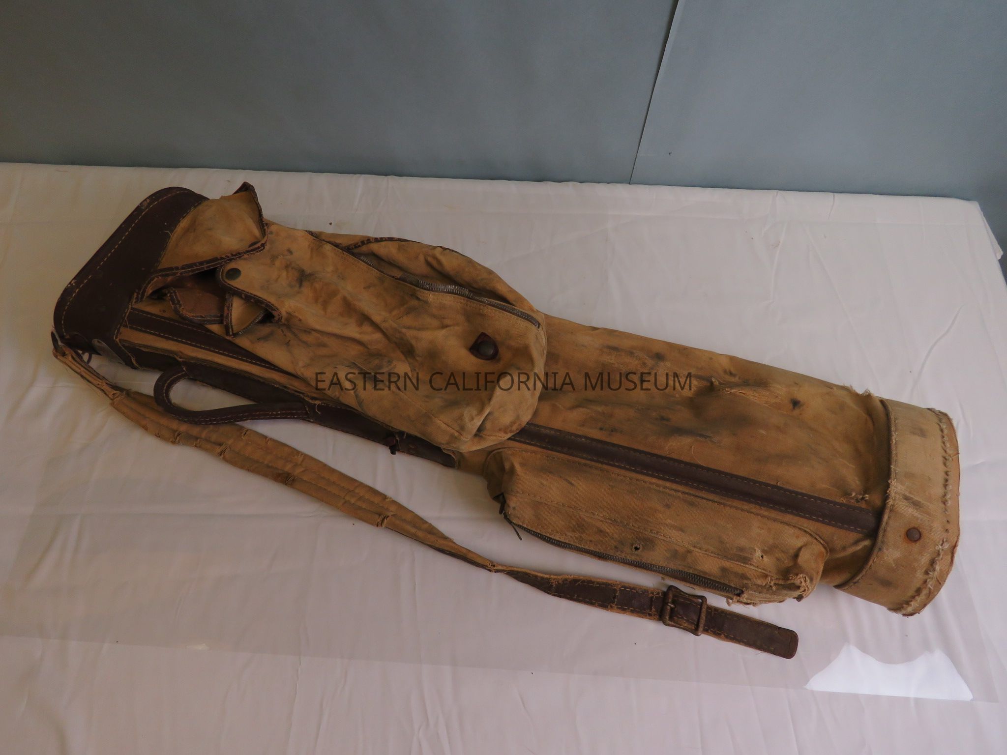 Canvas "Wilson Indestructo" golf bag used at Manzanar War Relocation Center. The bottom has completely detached and one zipper is broken. Measures 33 1/2" x 9"Collection