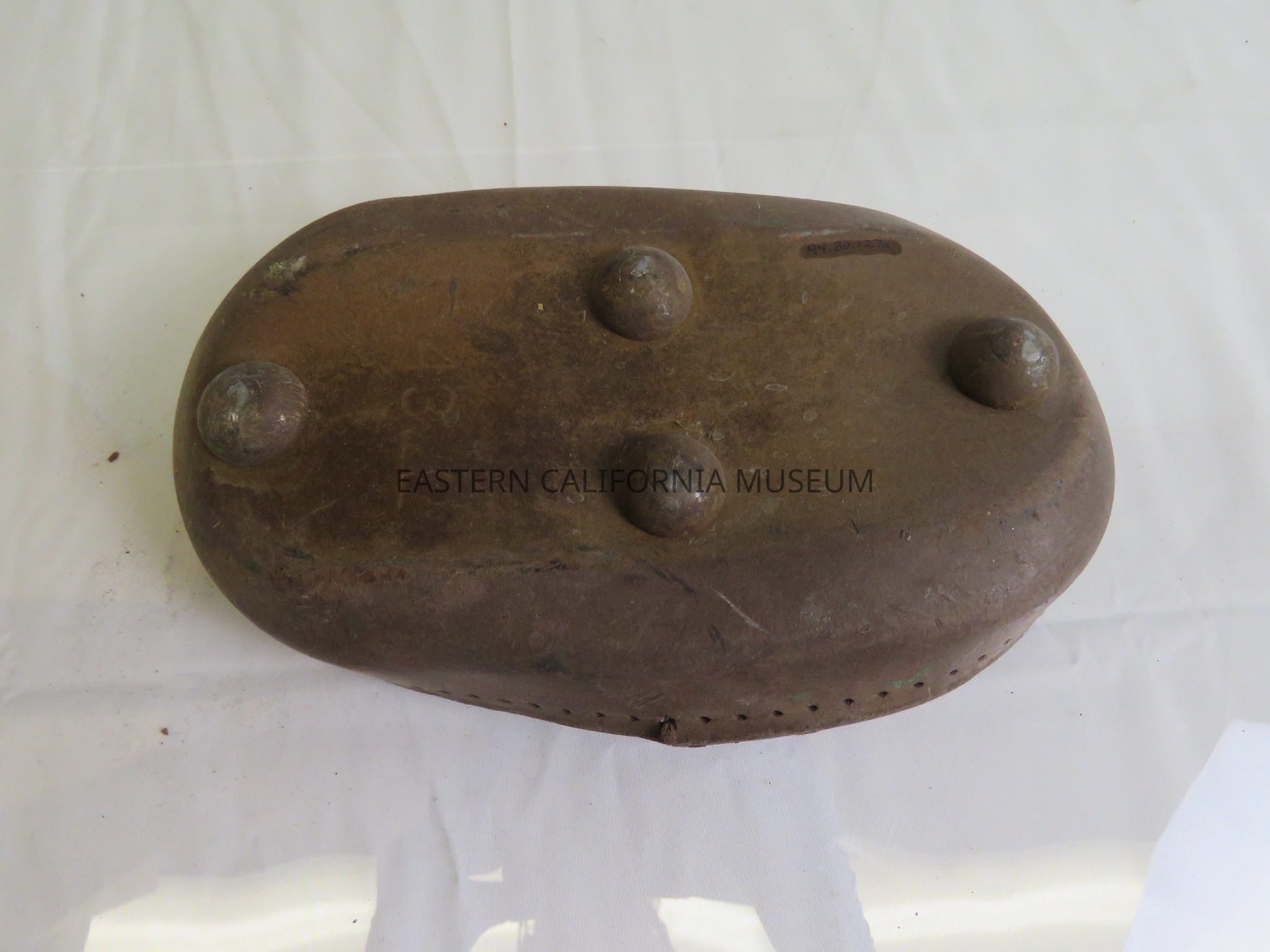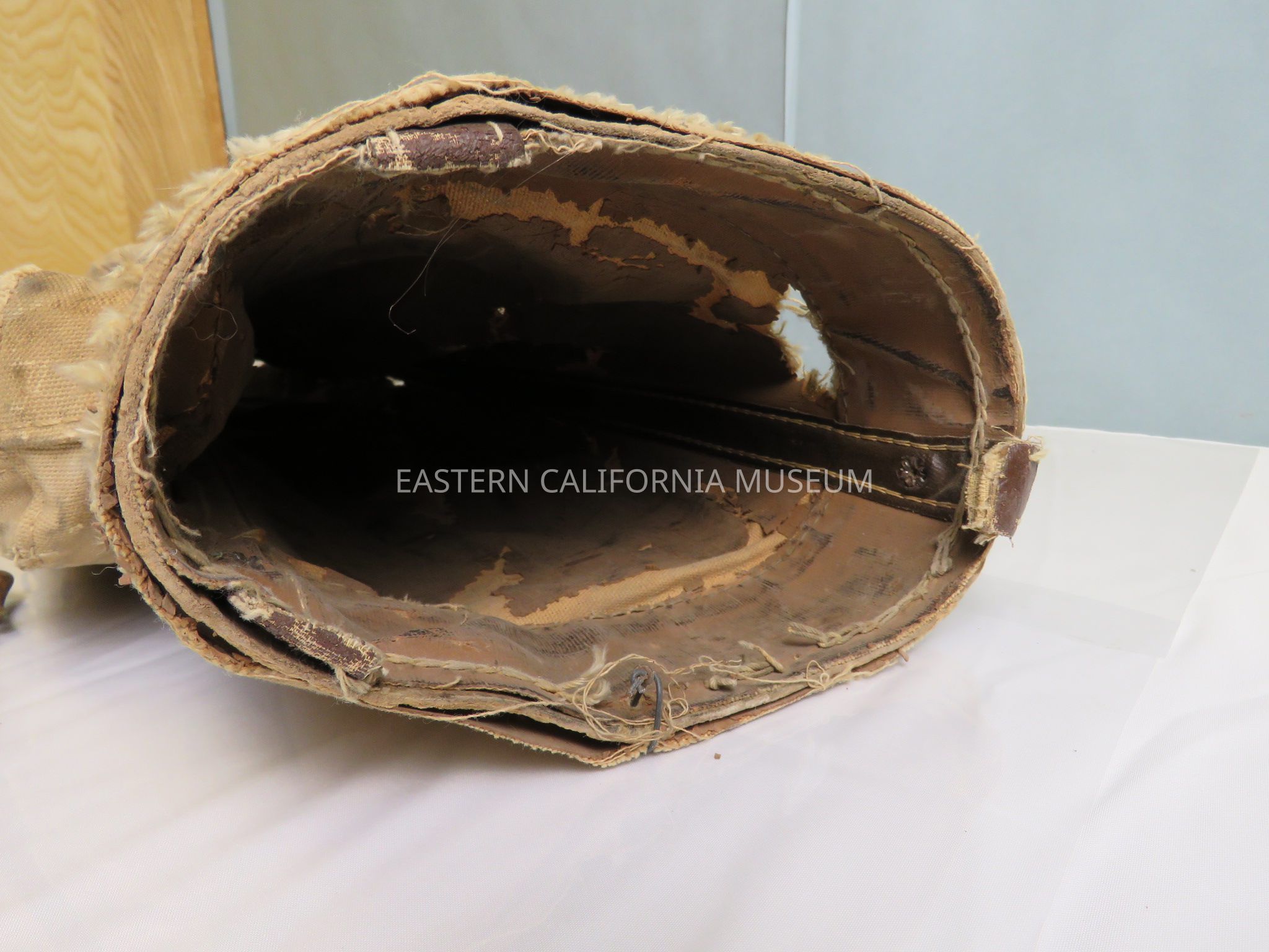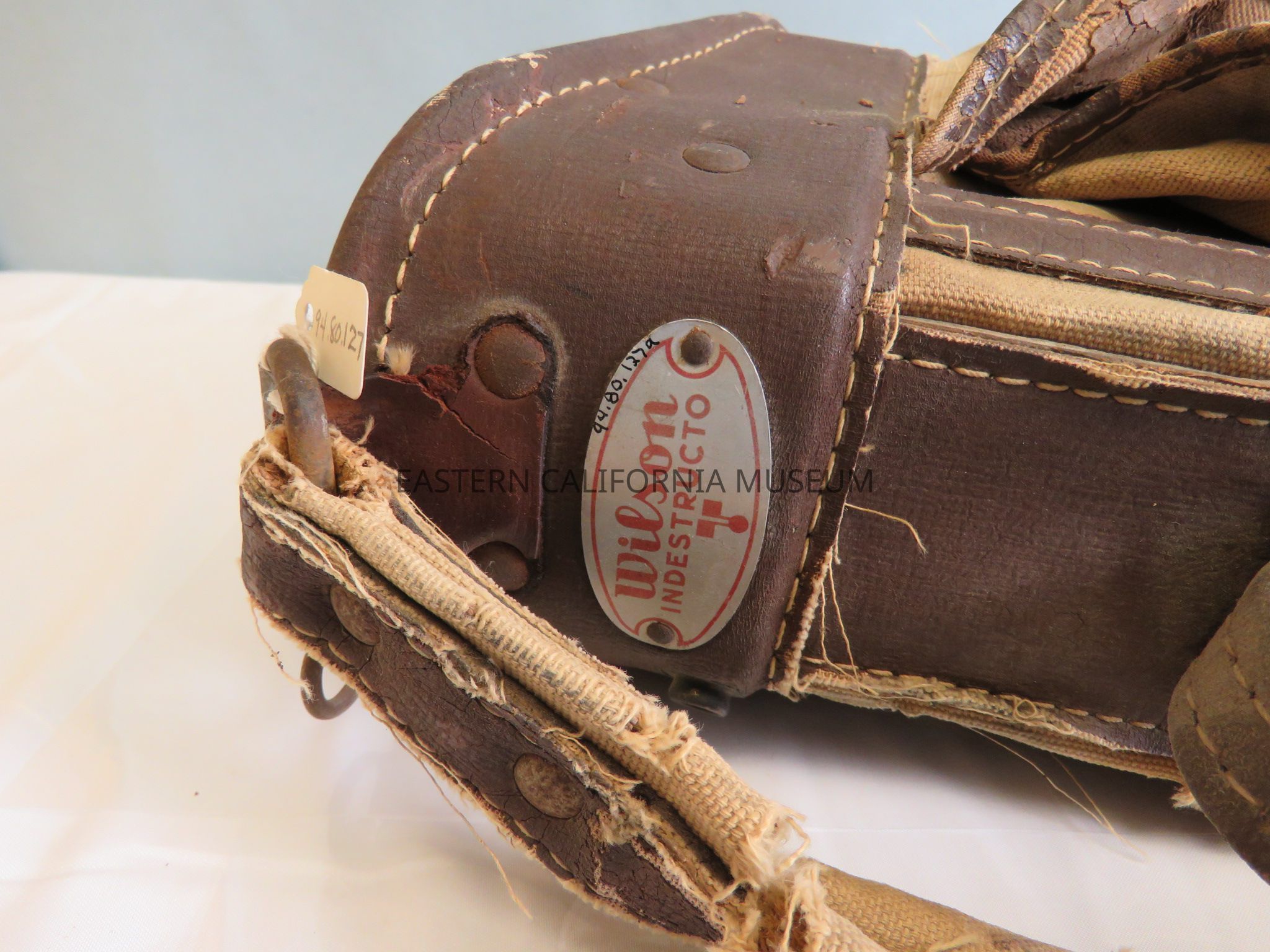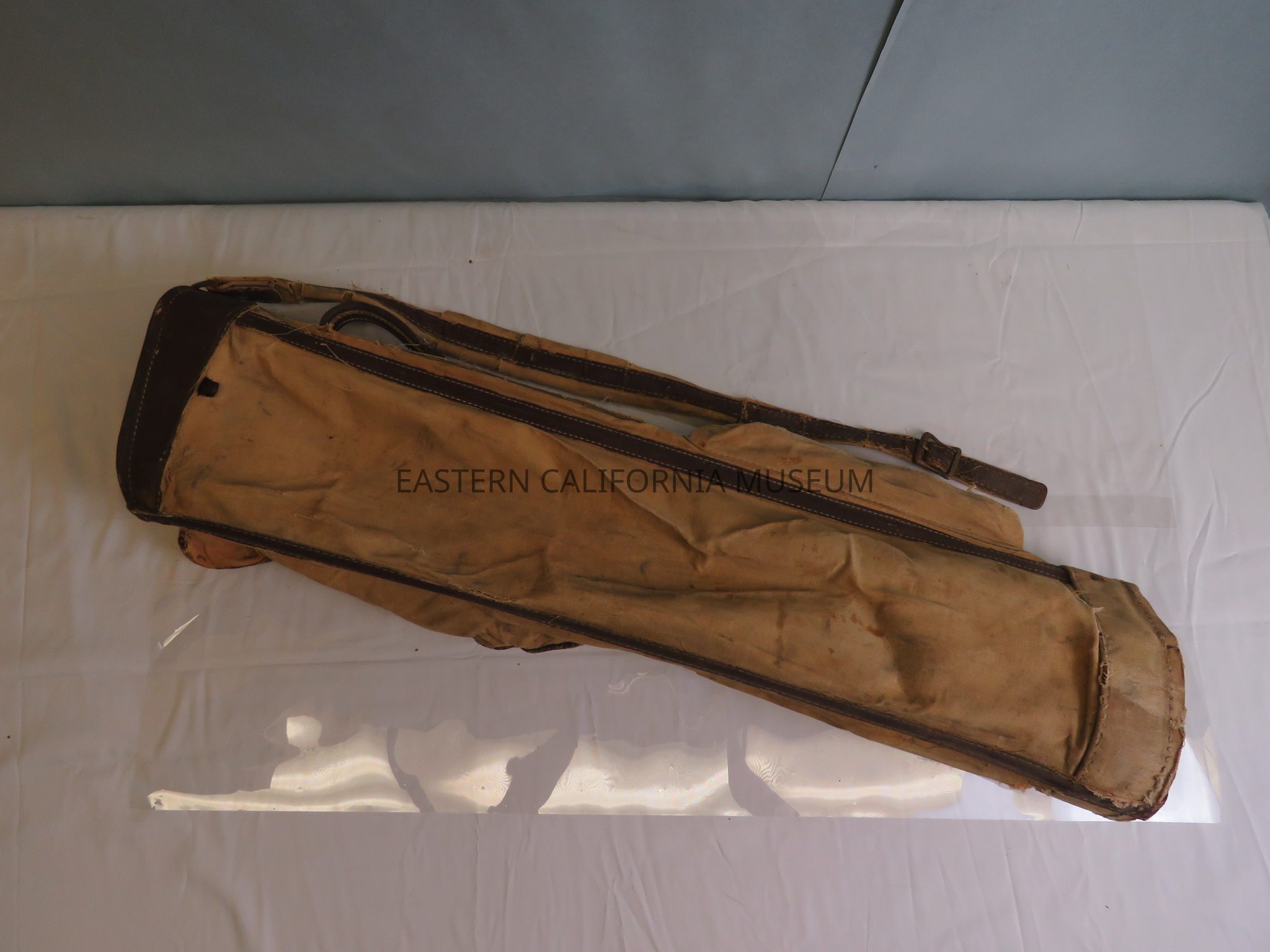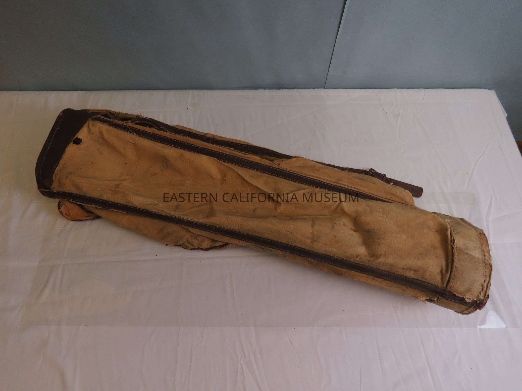 Canvas "Wilson Indestructo" golf bag used at Manzanar War Relocation Center. The bottom has completely detached and one zipper is broken. Measures 33 1/2" x 9"Collection