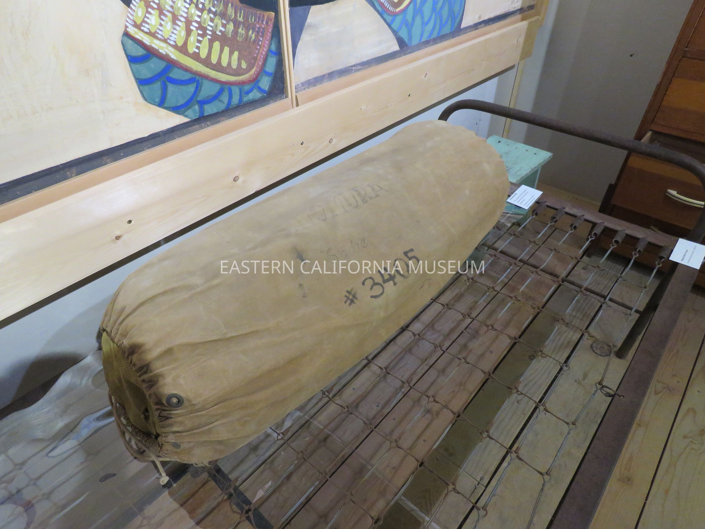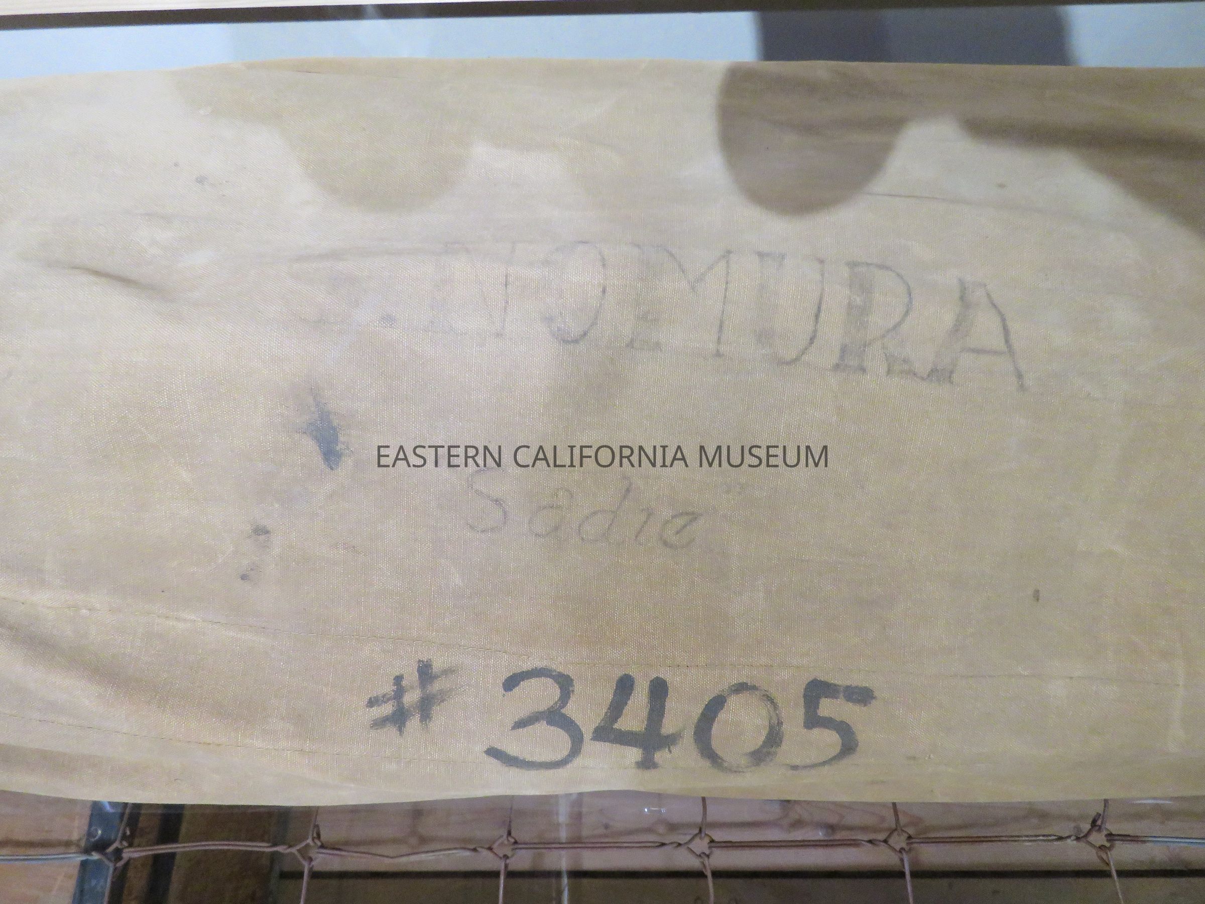 Tan color sleeping bag and pouch with "S. Nomura #3405" written on it. It belonged to Sadae Nomura Iwataki, resident of Manzanar War Relocation Center Block 21.Collection