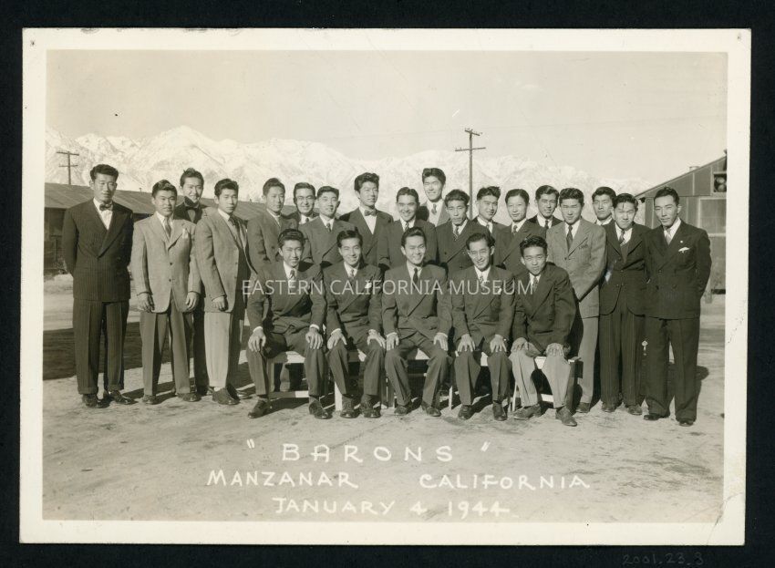 Photo of a group of men in suits posing outside in front of barracks with the Sierra Nevada in the background. The photo is labeled, "Barons, Manzanar California, Jnauary 4, 1944."Collection