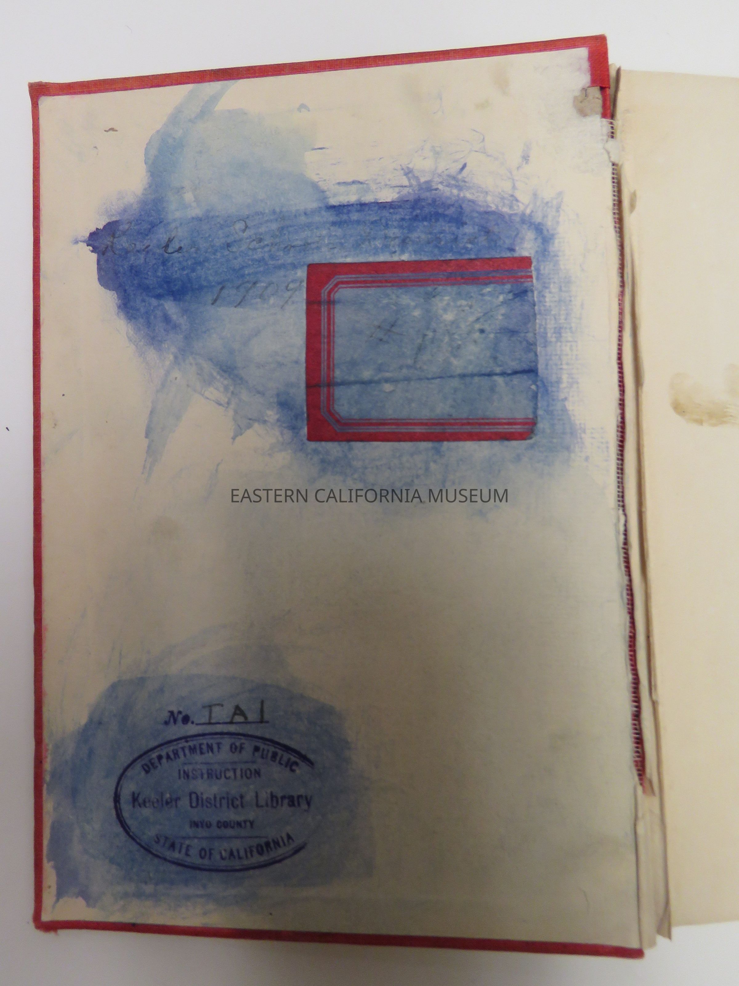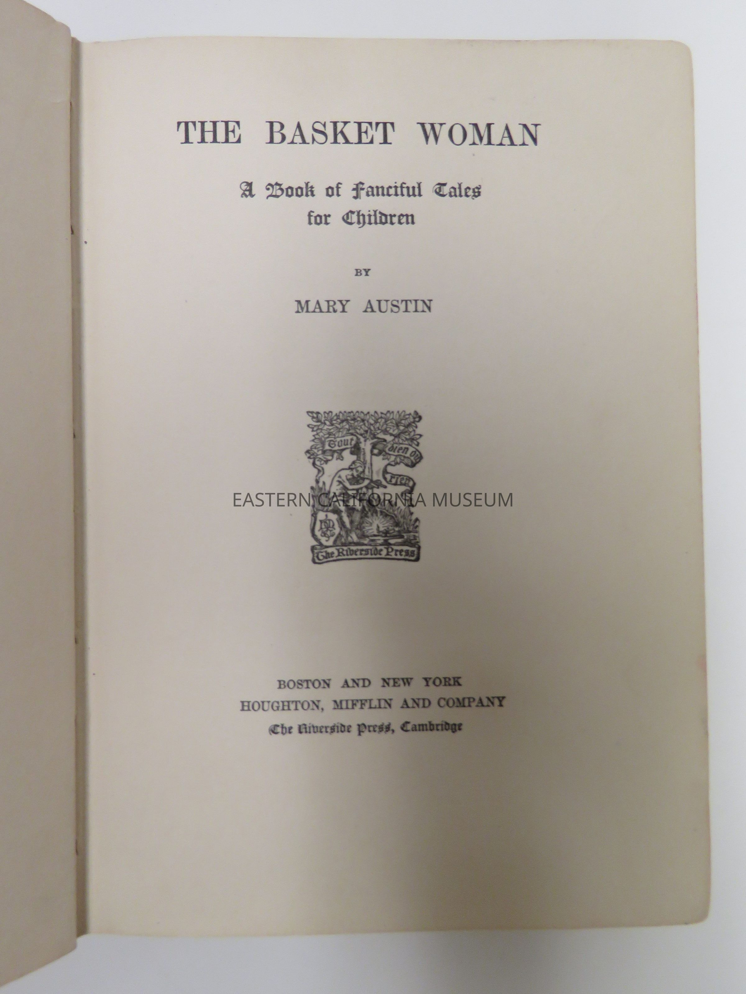 "The Basket Woman: A Book of Fanciful Tales for Children" is ex-libris from the Keeler District Library in Inyo County, California. It has "Keeler School, 1909" written on inside front cover. There is a lot of blue ink on the inside front cover covering writing, stamps, and a label. Page 181 is torn in half and there is a newspaper article about Mahala Joe affixed to page 183. It was found in collection but probably belonged to Lillian Hilderman.Book Details