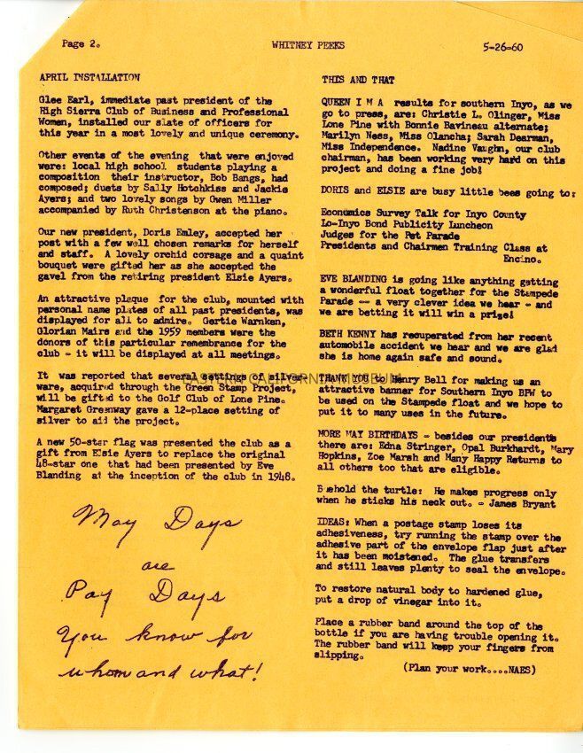The "Whitney Peeks" newsletter published by the Southern Inyo Business and Professional Women's Club. This one is identified as, "Vol. 3, No. 1" and "May 26, 1960." Three letter sized pages all of which are an orange color.Collection
