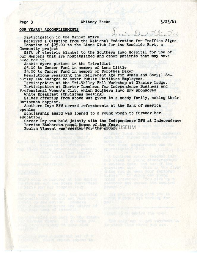 The "Whitney Peeks" newsletter published by the Southern Inyo Business and Professional Women's Club. This one is identified as, "Vol. 3, No. 11" and "March 23, 1961." Three pages.Collection