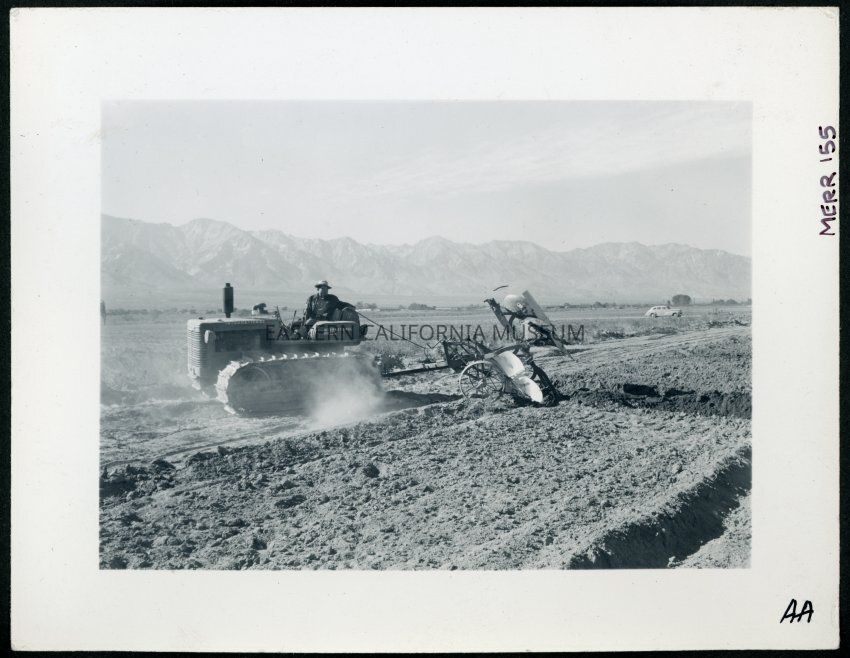Summary from Library of Congress: "A tractor pulls a plow through a field, mountains in the background"