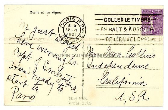 Photo postcard of the city of Bern, Switzerland and the Alp mountain range. It was sent to Mrs. Dora Collins of Independence, but the writer did not sign their name (maybe Helen Gunn?). The cancellation stamp is from Paris in 1921 and the stamp is a French purple/blue 60 cent.