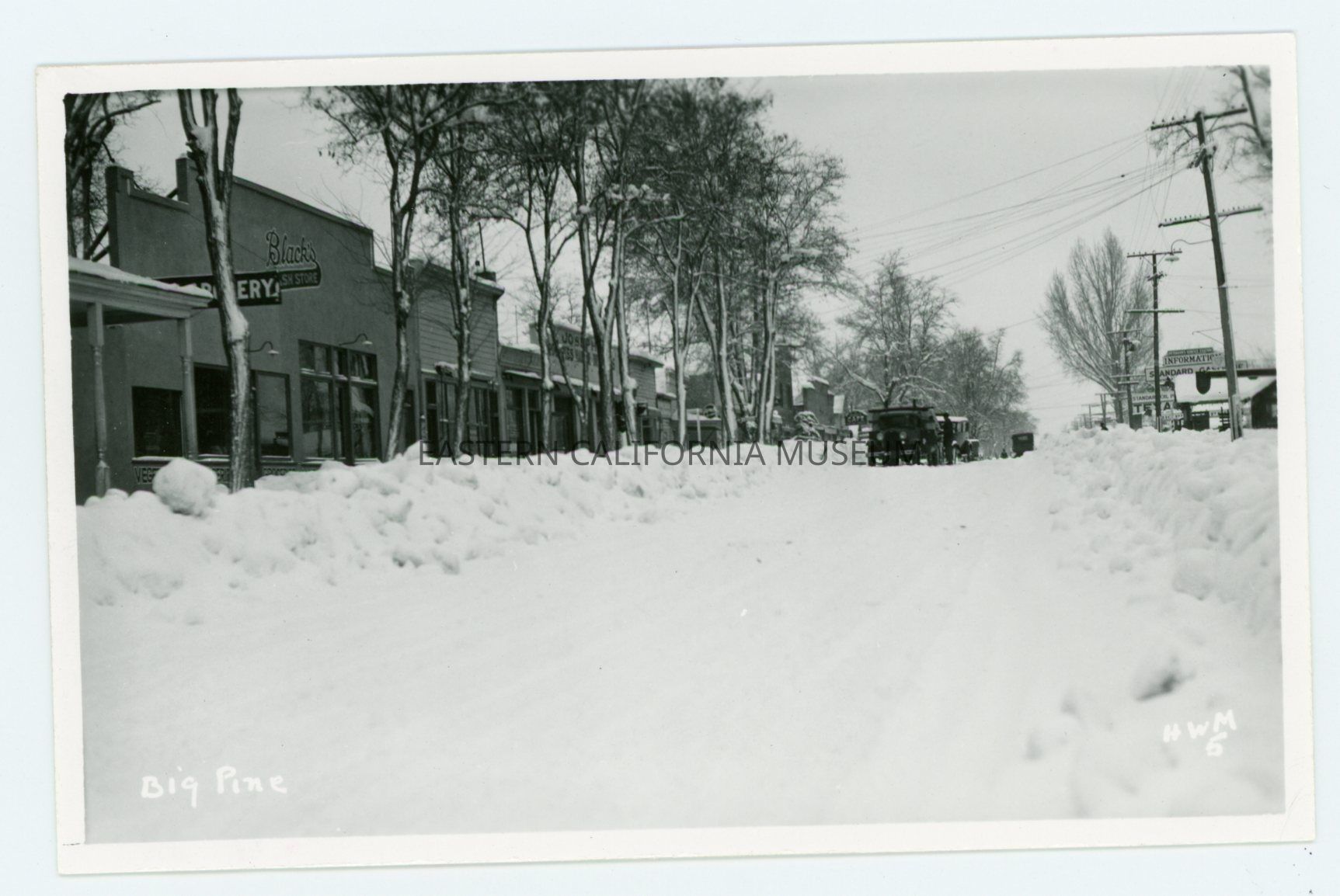 Photo postcard titled "Big Pine" taken by Harry W. Mendenhall and given his photo ID #5. It was taken after a heavy snow, and there are a couple vehicles in the snow-covered street. Black's Cash Store, a grocery store, Joseph's store, Standard station, Texaco station, and Drake's Cafe are all visible.