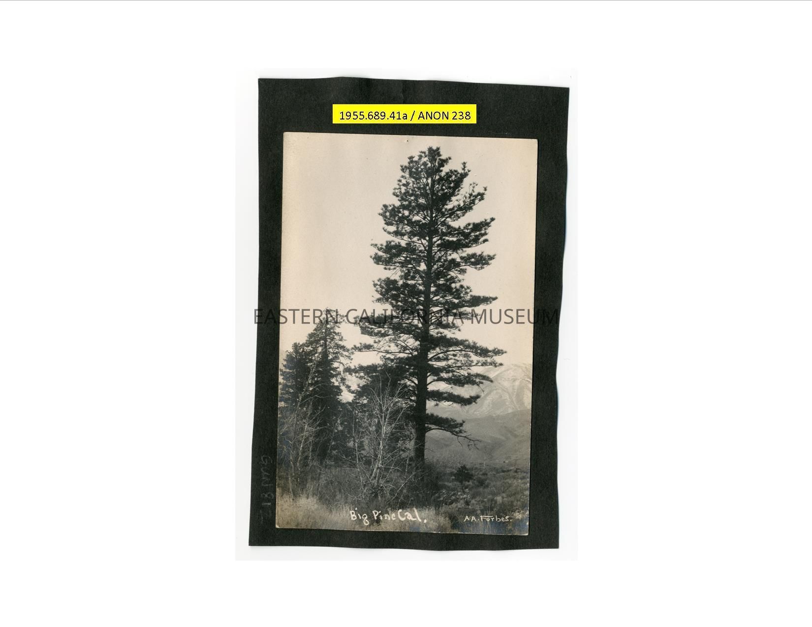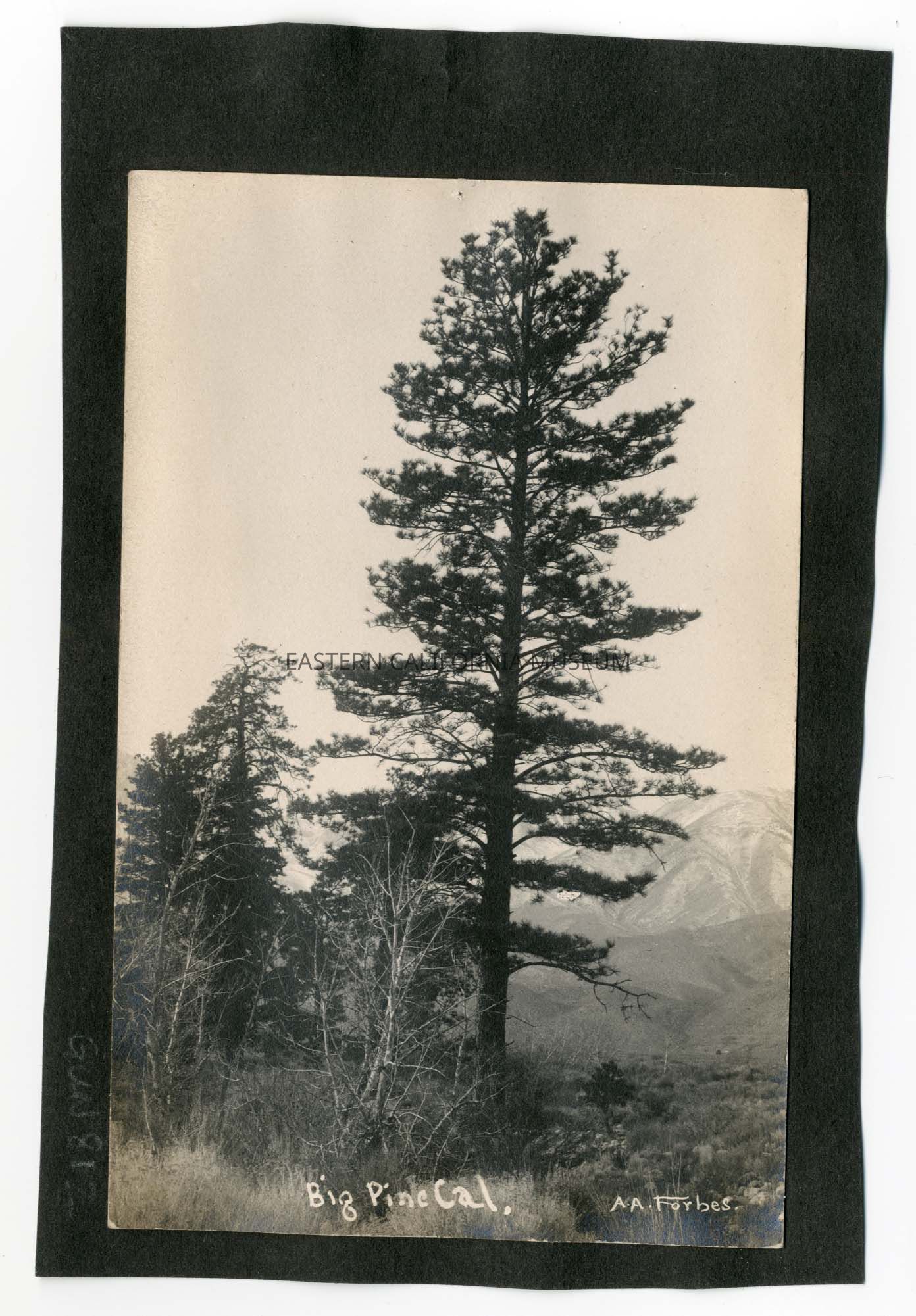 Photo of a tall evergreen tree titled, "Big Pine, Cal." by photographer A. A. Forbes. It may be the original "big pine" tree that the town of Big Pine is named after.Made/Created