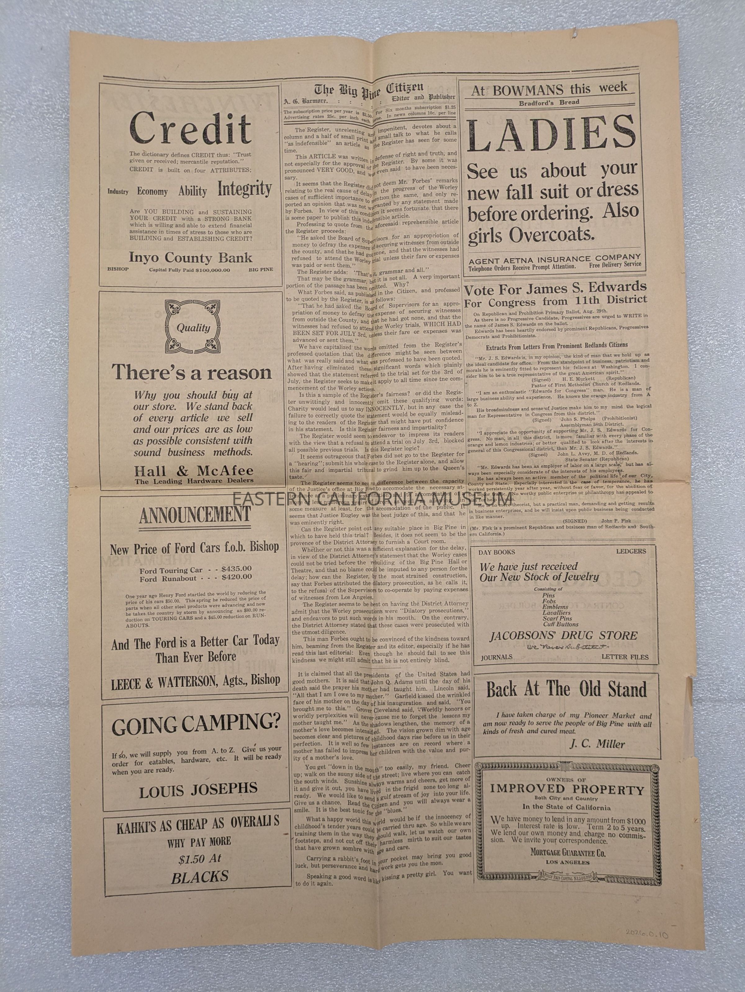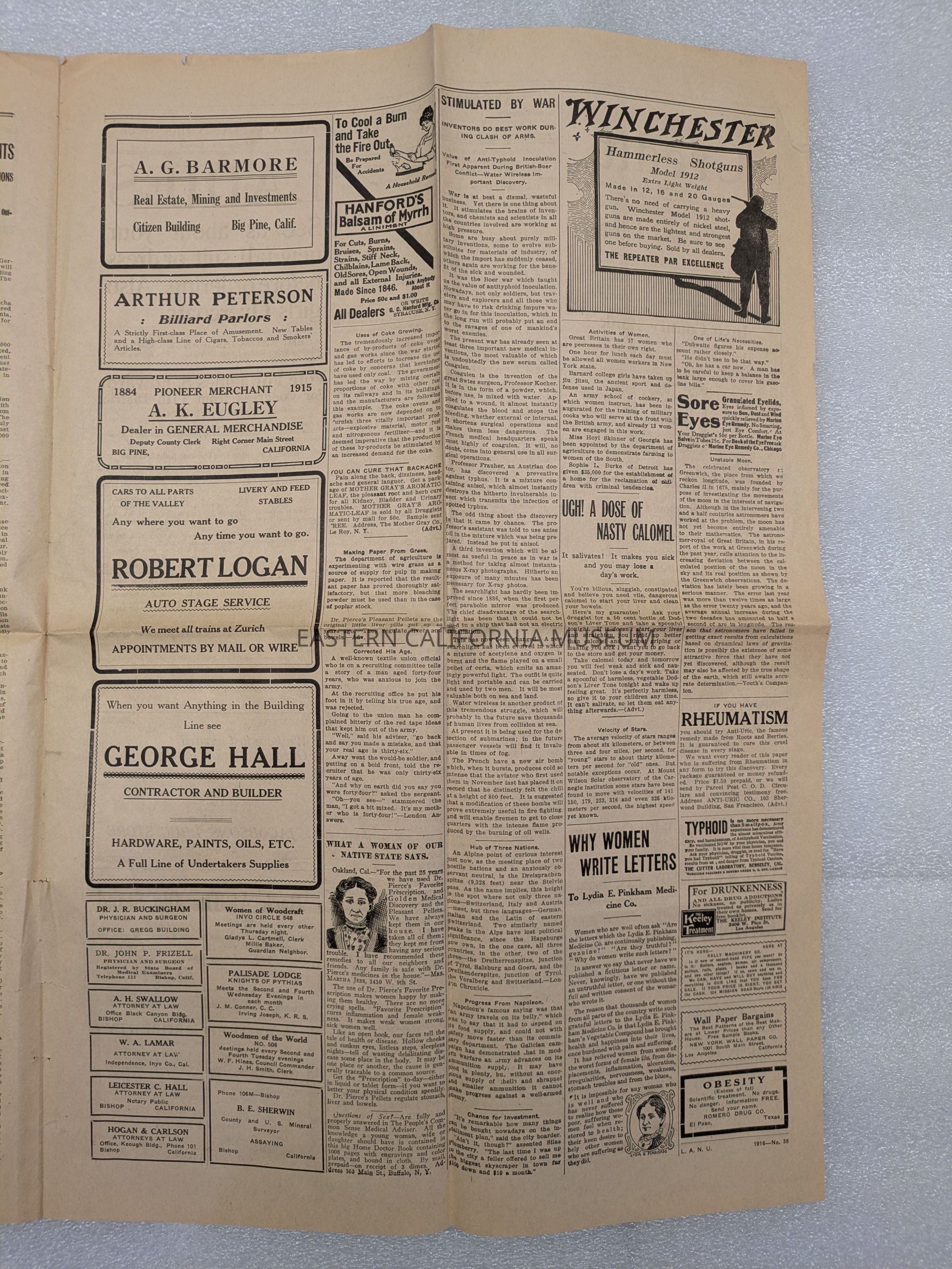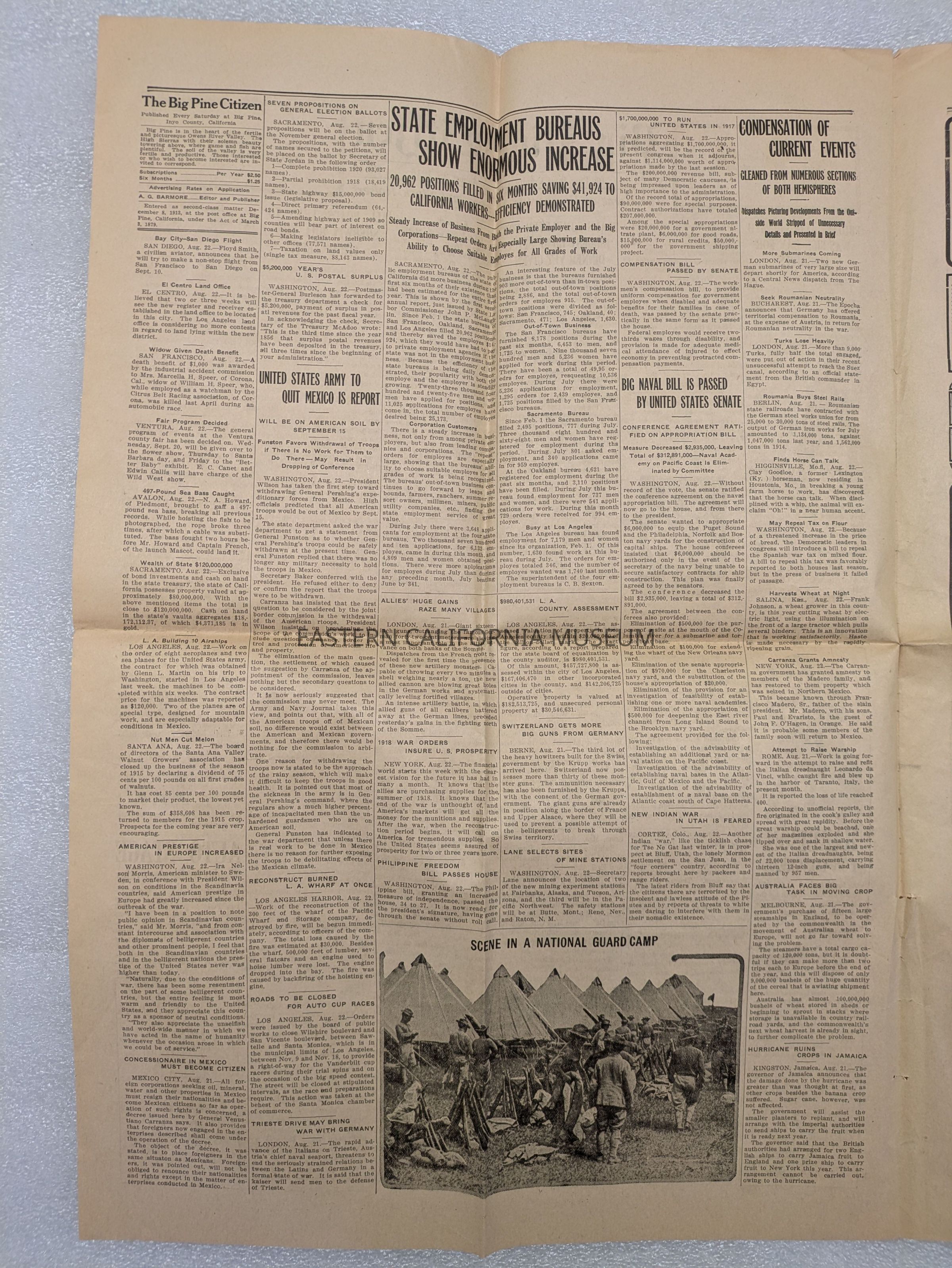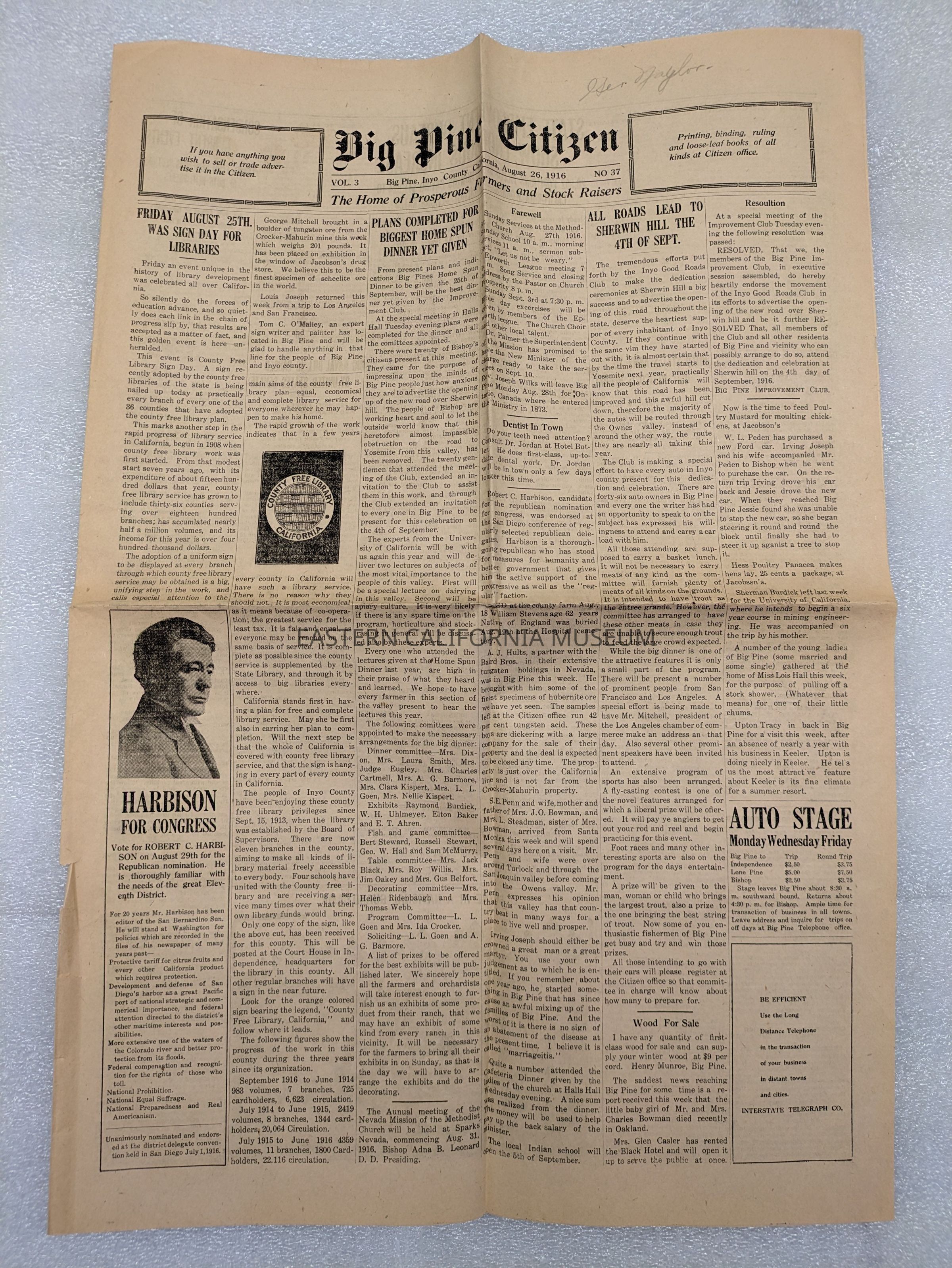 Newspaper: Big Pine Citizen, Vol. 3, No. 37, August 26, 1916. Has "Geo. Naylor" written on it.