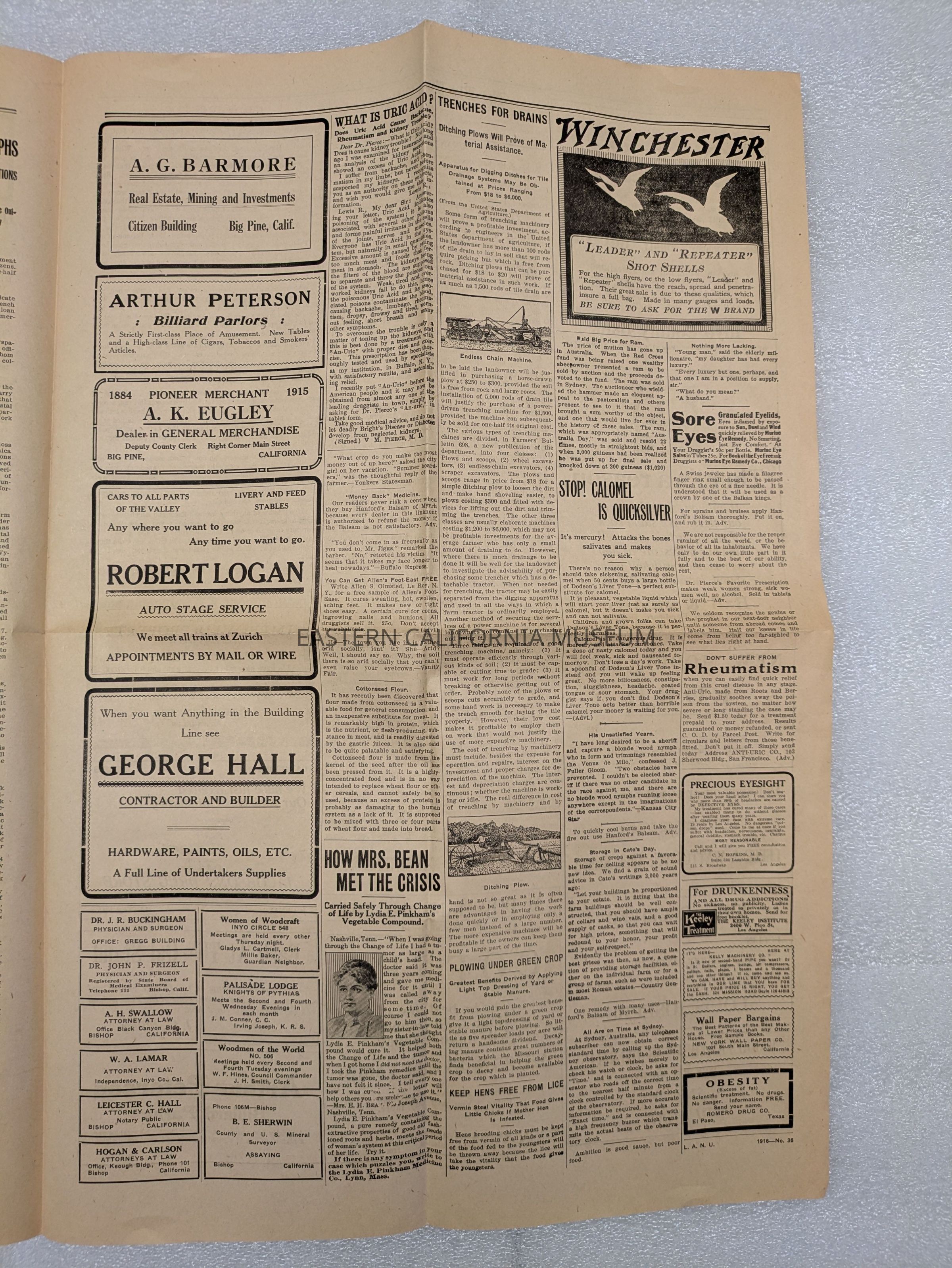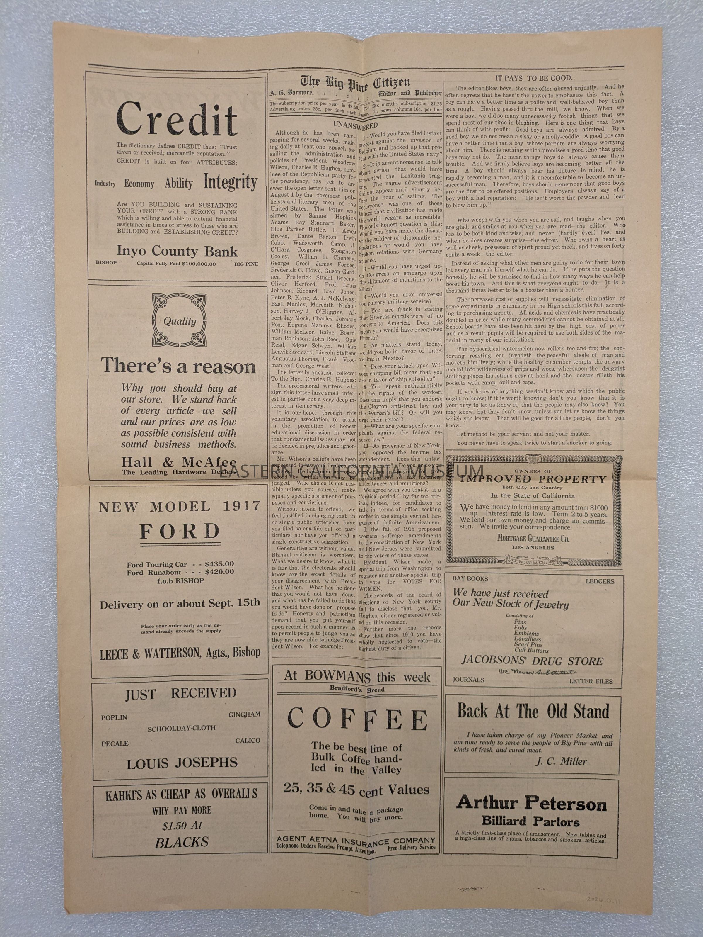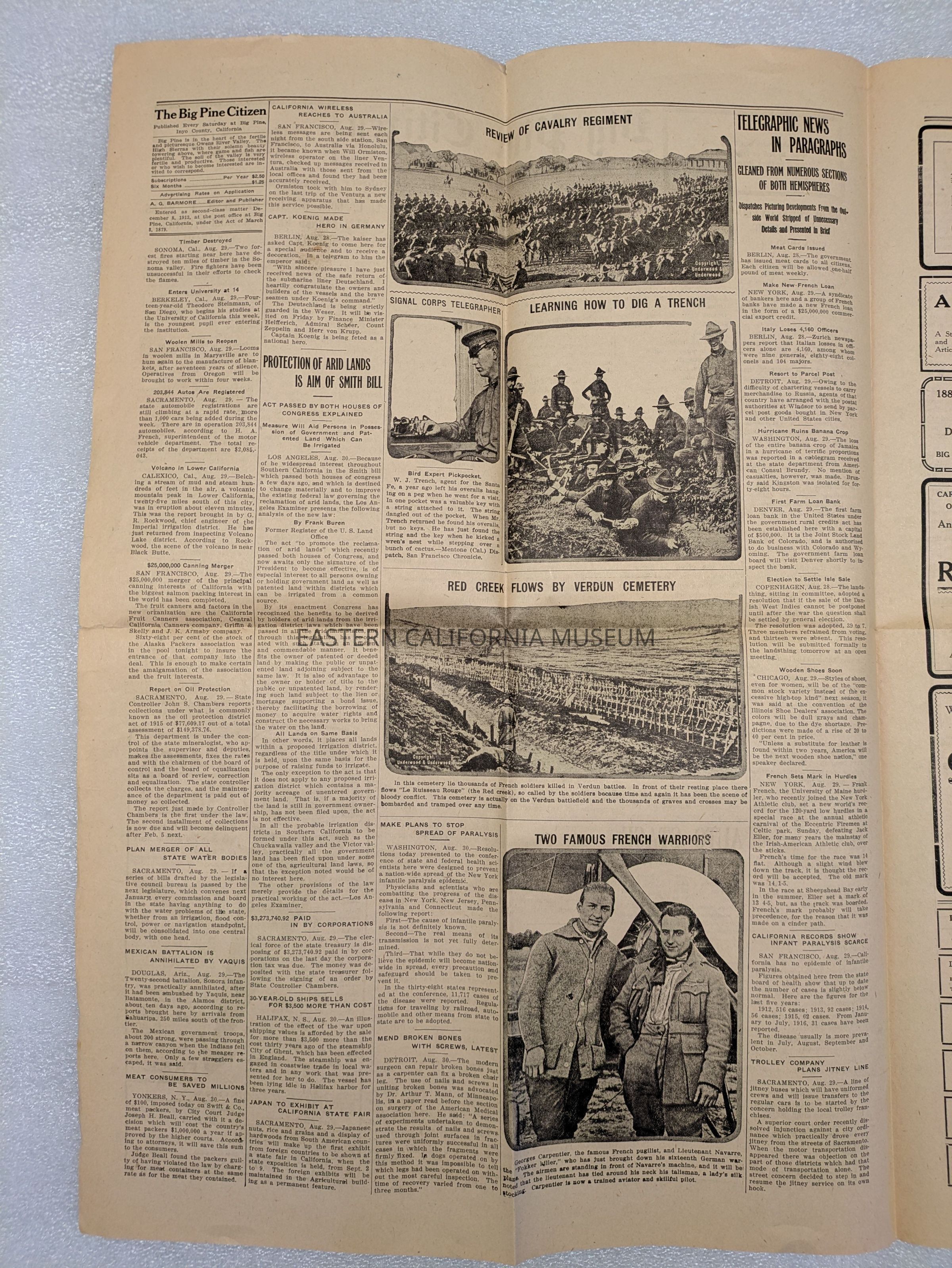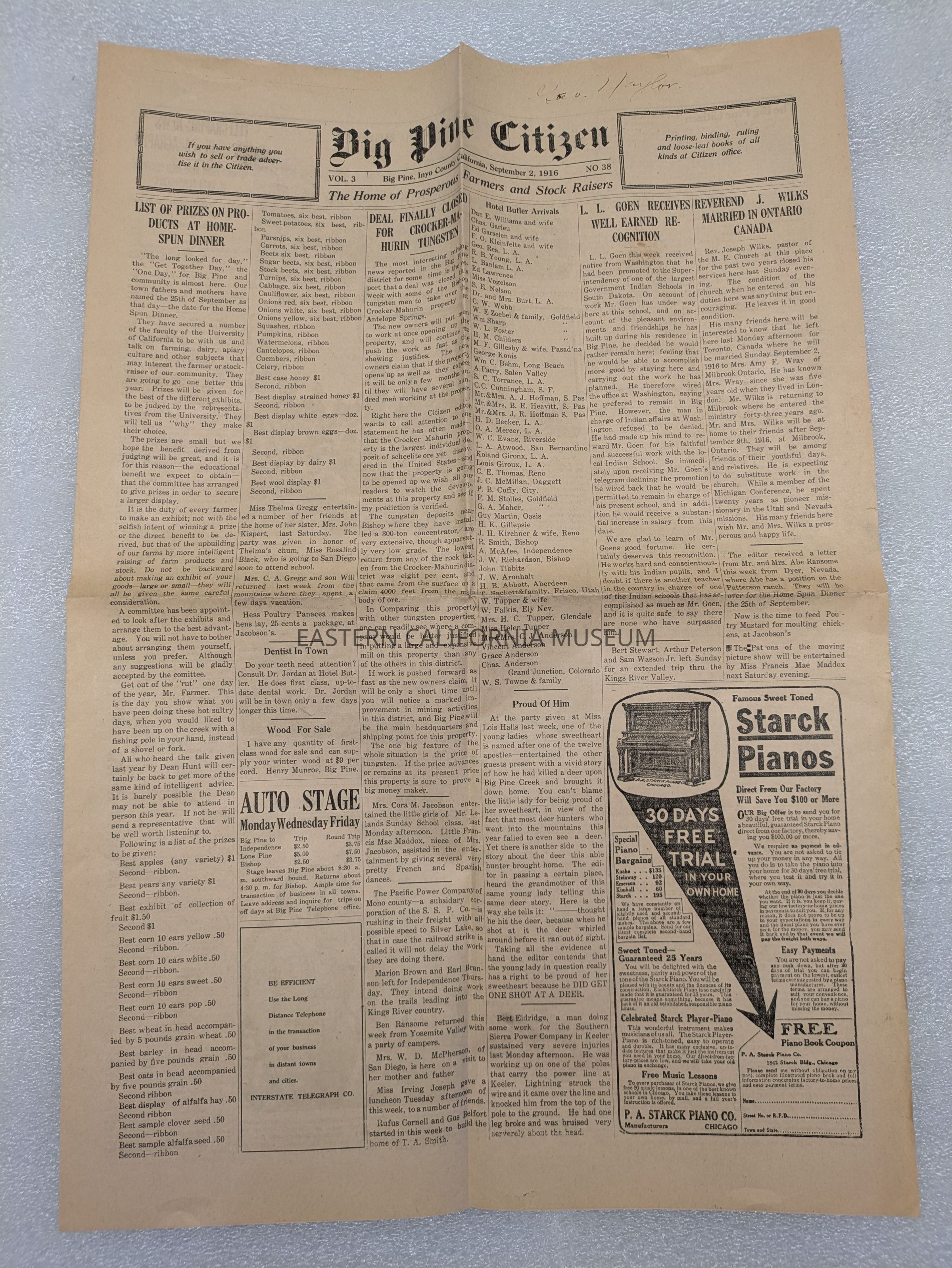 Newspaper: Big Pine Citizen, Vol. 3, No. 38, September 2, 1916. Has "Geo. Naylor" written on it.