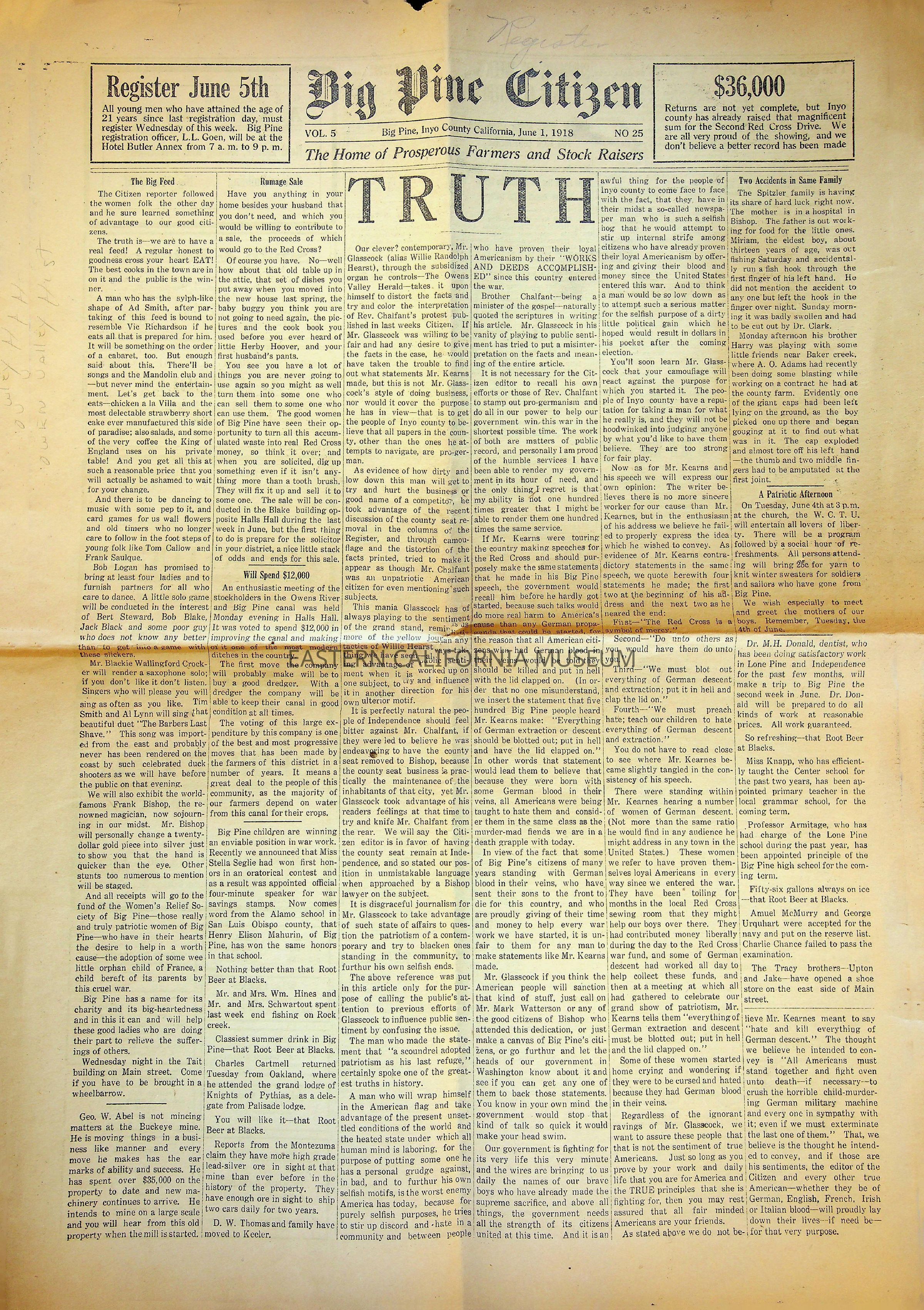 "Big Pine Citizen, Vol. 5, No. 25, June 1, 1918" has a large central headline of "TRUTH."Collection
