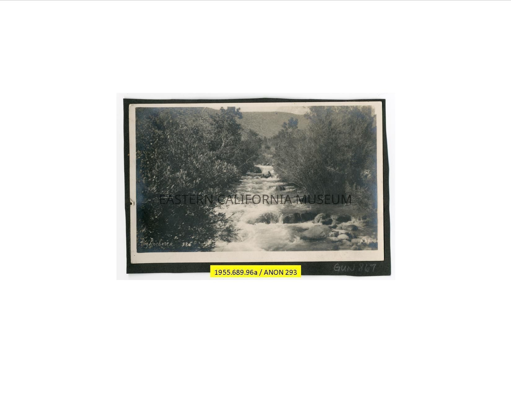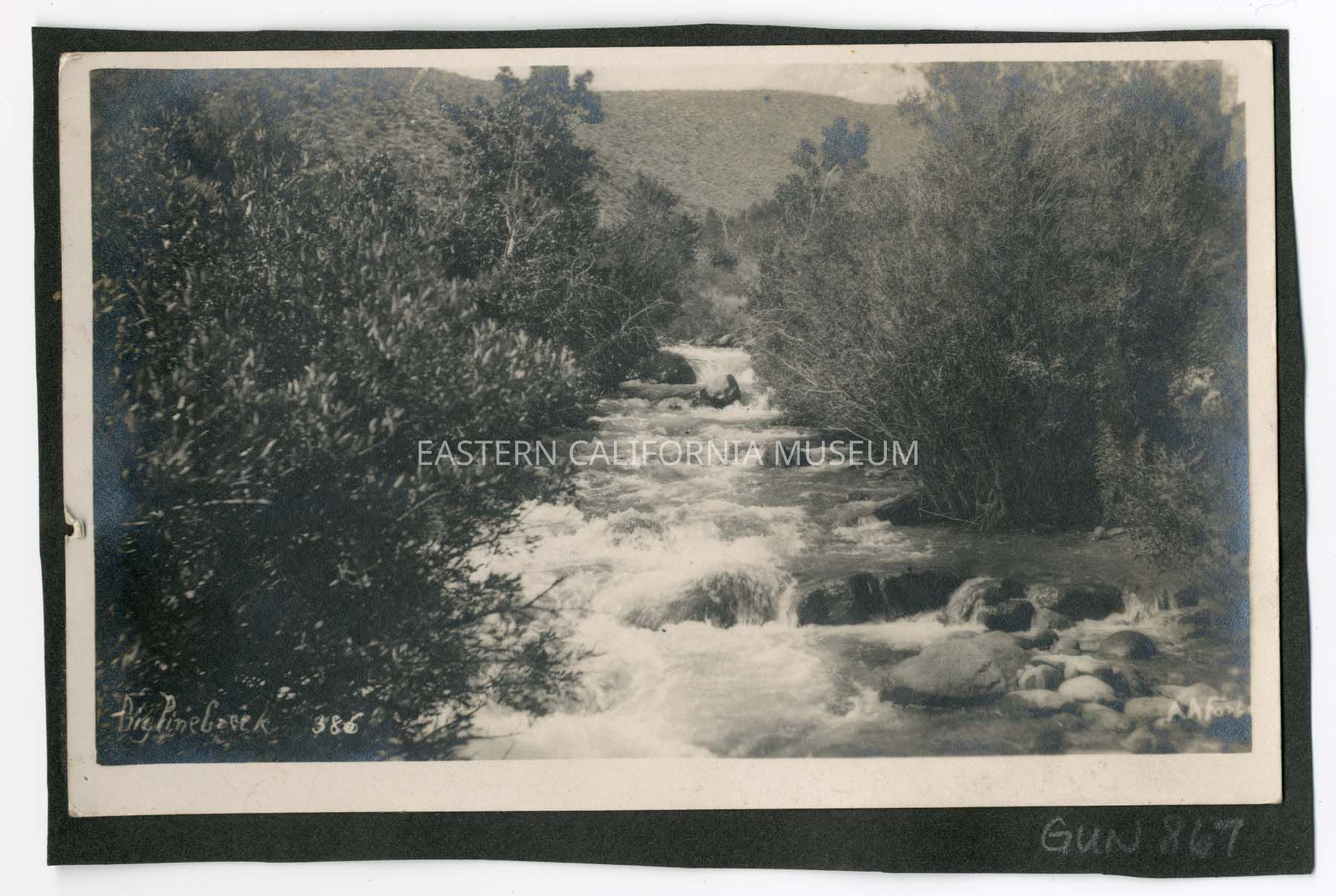 Photo of a rushing creek taken by photographer A. A. Forbes. It is titled, "Big Pine Creek" and given his ID #386.