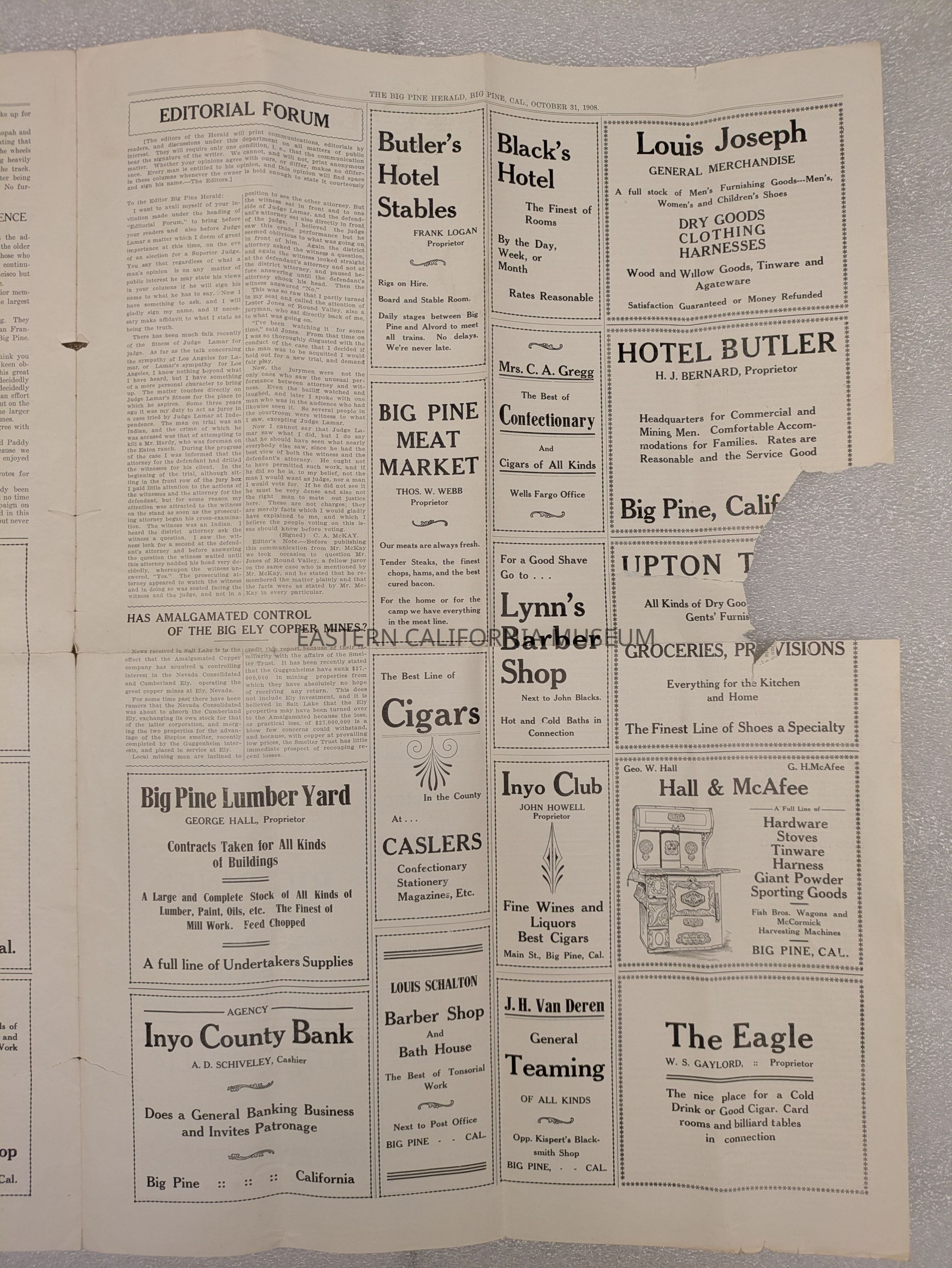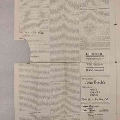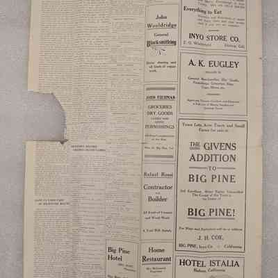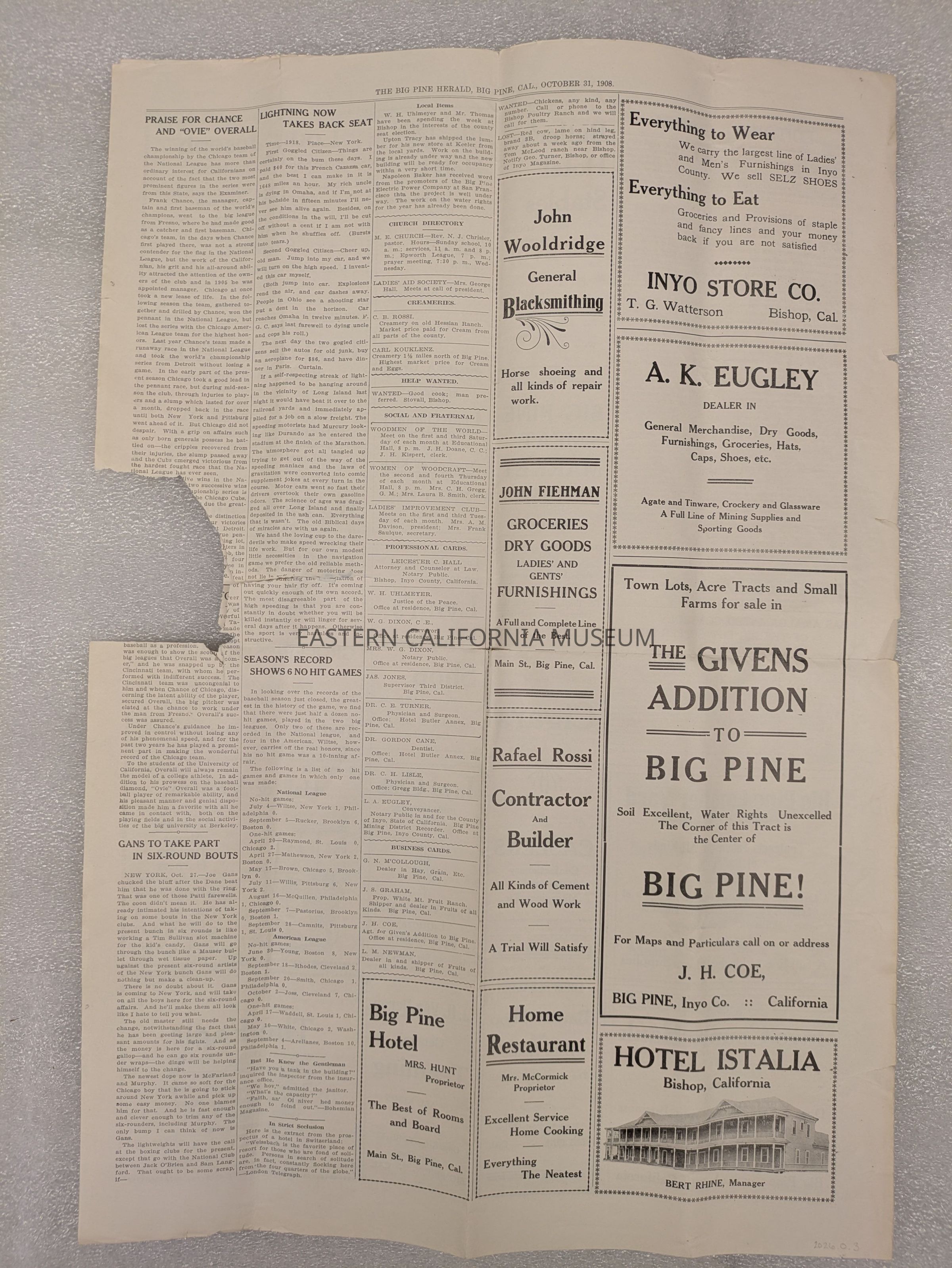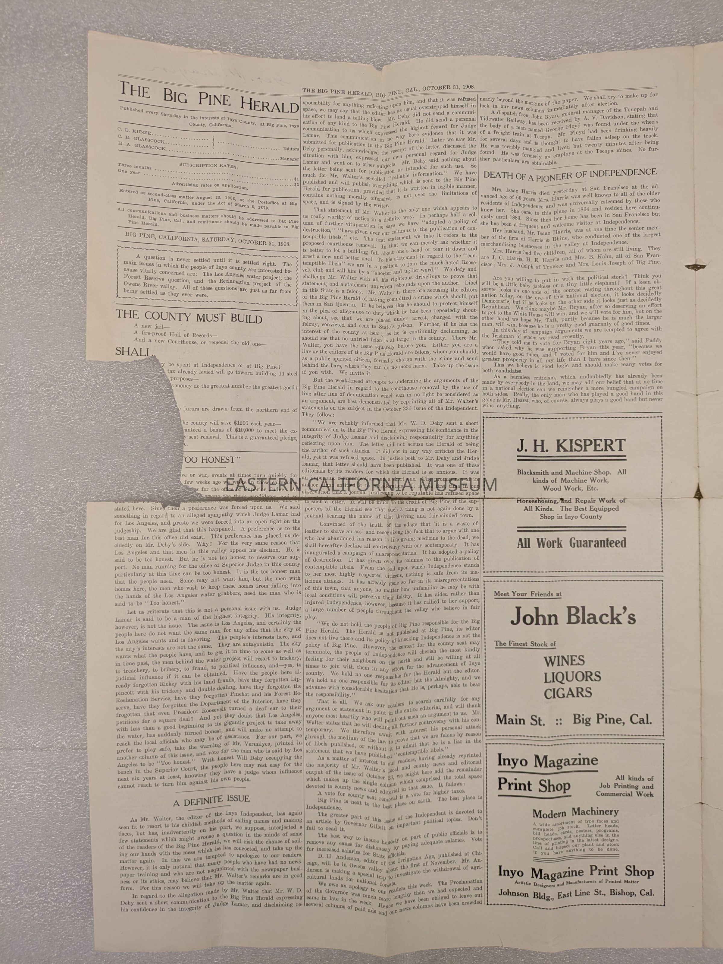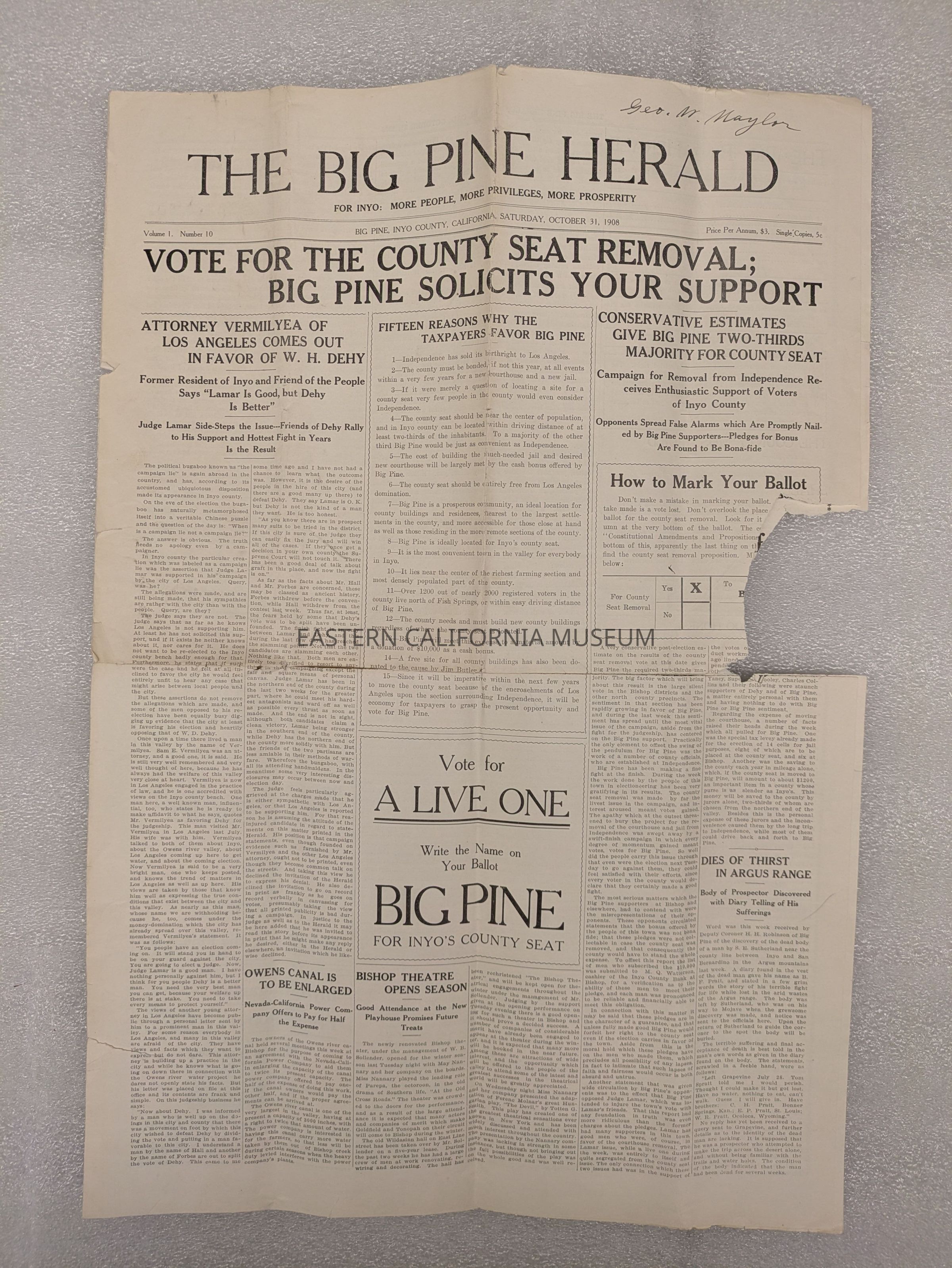 Newspaper: Big Pine Herald, Vol. 1, No. 10, October 31, 1908. Has "Geo. W. Naylor" written on it.