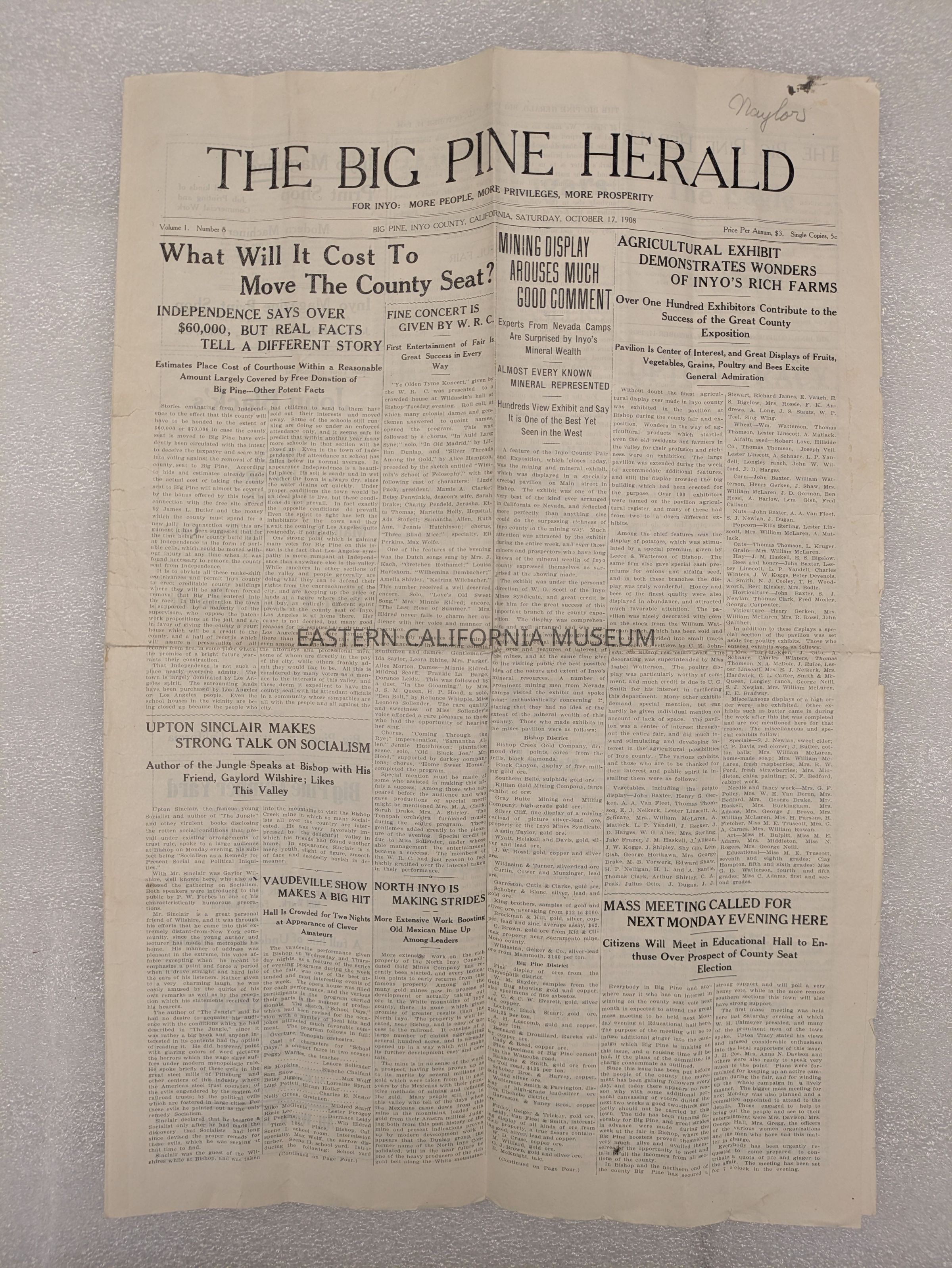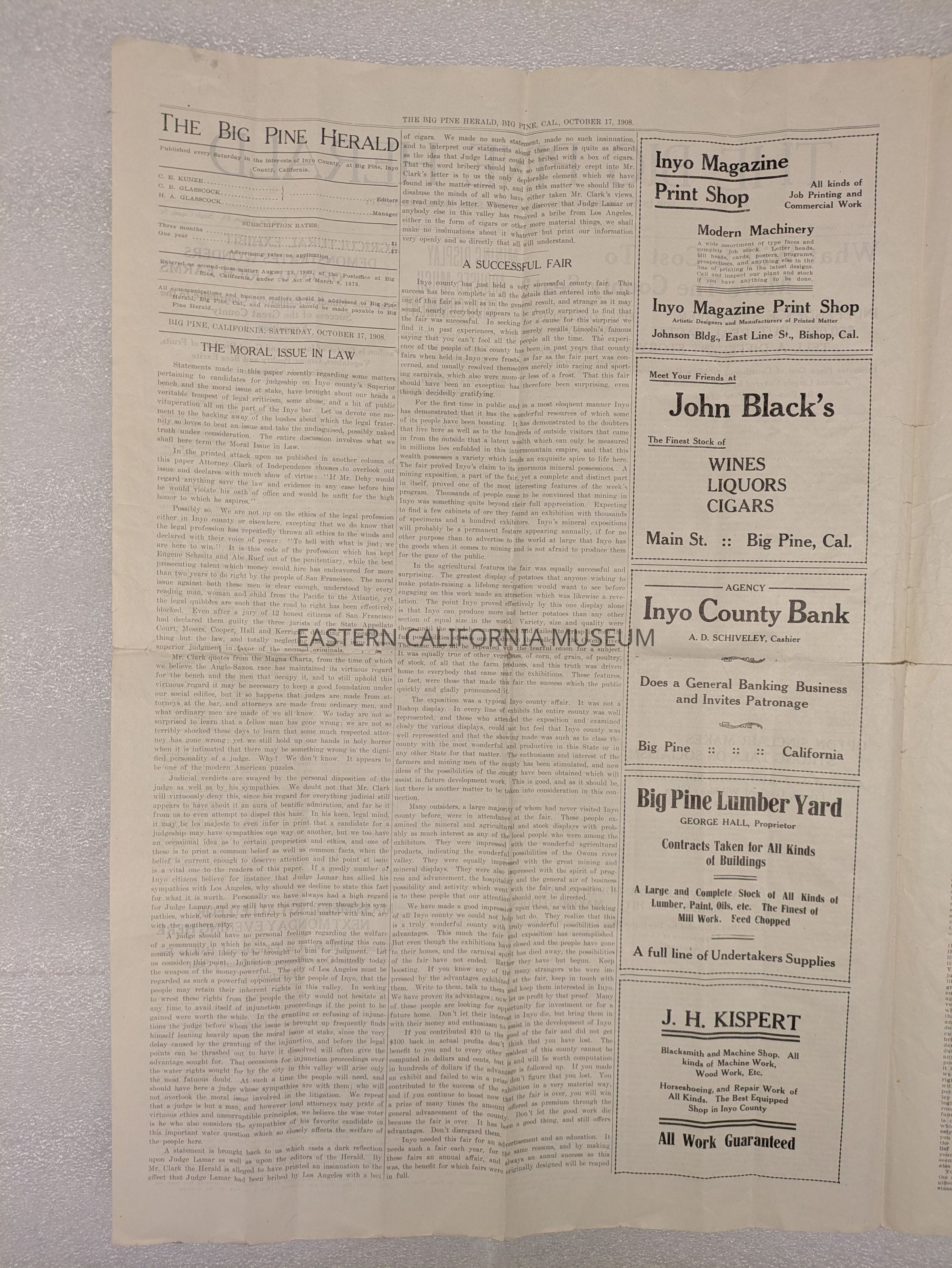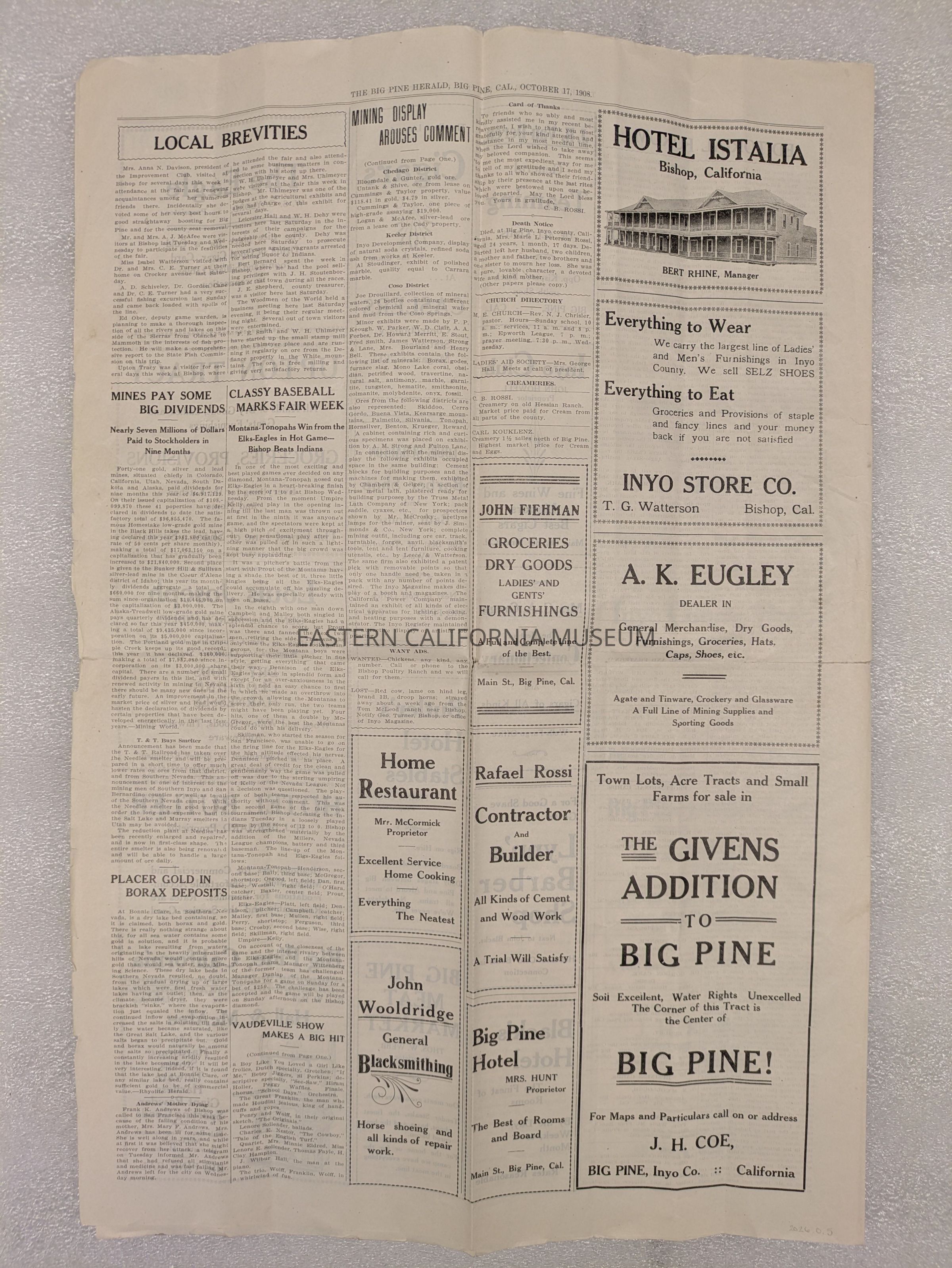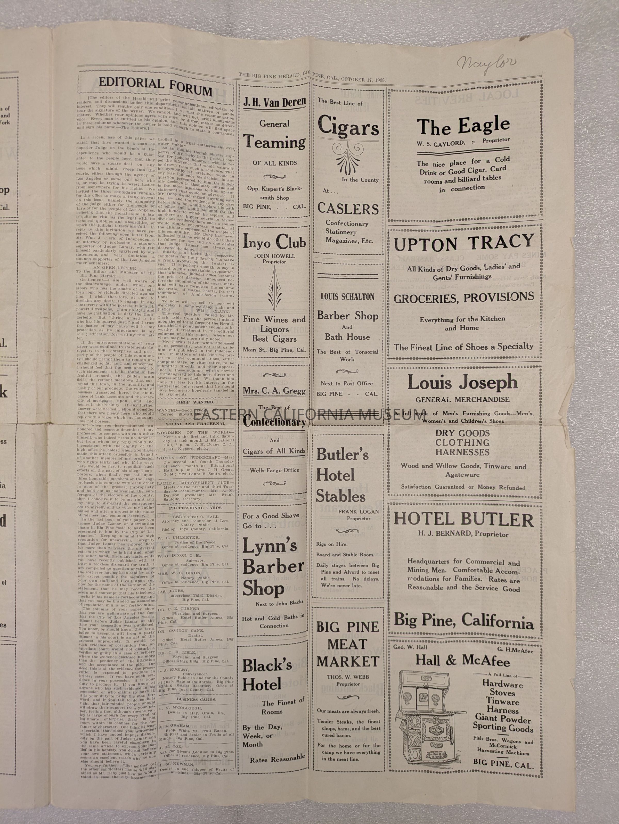 Newspaper: Big Pine Herald, Vol. 1, No. 8, October 17, 1908. Has "Naylor" written on it.