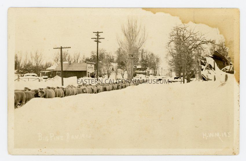 Photo postcard showing a long column of sheep walking through a narrow path in deep snow through the streets of the town of Big Pine. There appears to be a collapsed building to the right, and on the left is the Belfort and Co. building and a sign for a garage. It is titled, "Big Pine, Jan. 1916" and the photographer was H. W. Mendenhall, who gave it ID #195.Photograph Details
