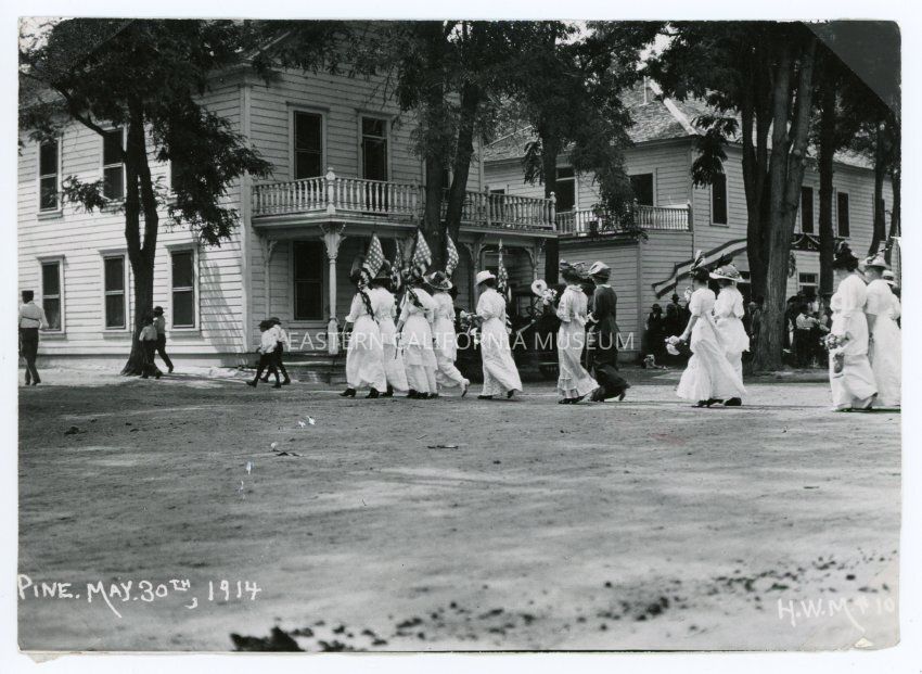 Photo of a group of women carrying flags and flowers and wearing white dresses. They are walking in front of the Butler Hotel (and its annex on the left) in Big Pine. It is titled, "Big Pine, May 30, 1914" and the photographer was Harry W. Mendenhall, who gave it his ID #10.