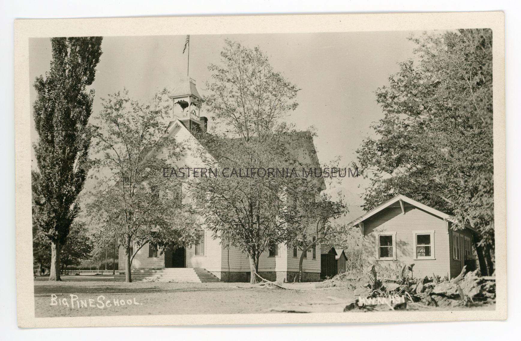 Photo postcard titled, "Big Pine School" taken by photographer H. W. Mendenhall and given his ID #431. It shows a two story white school house with a bell tower and flag flying from the top of the cupola.Photograph Details