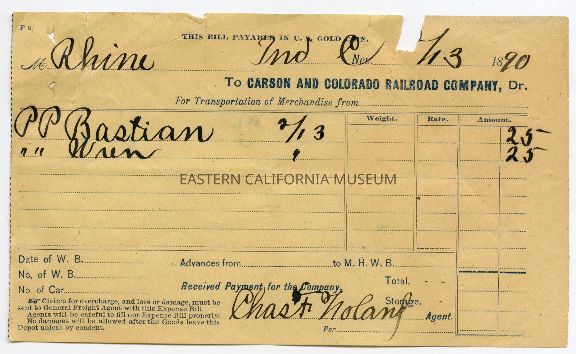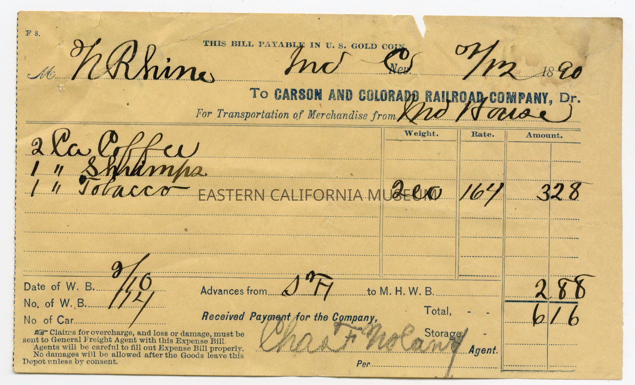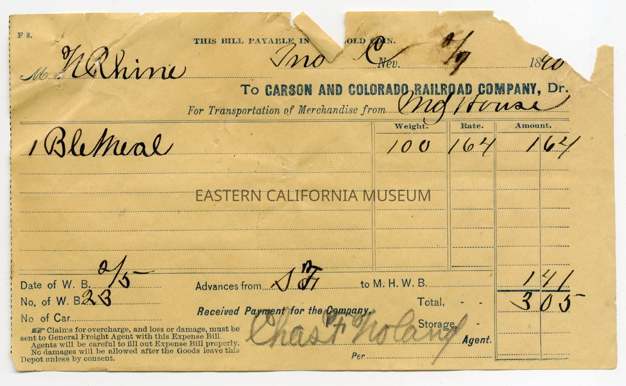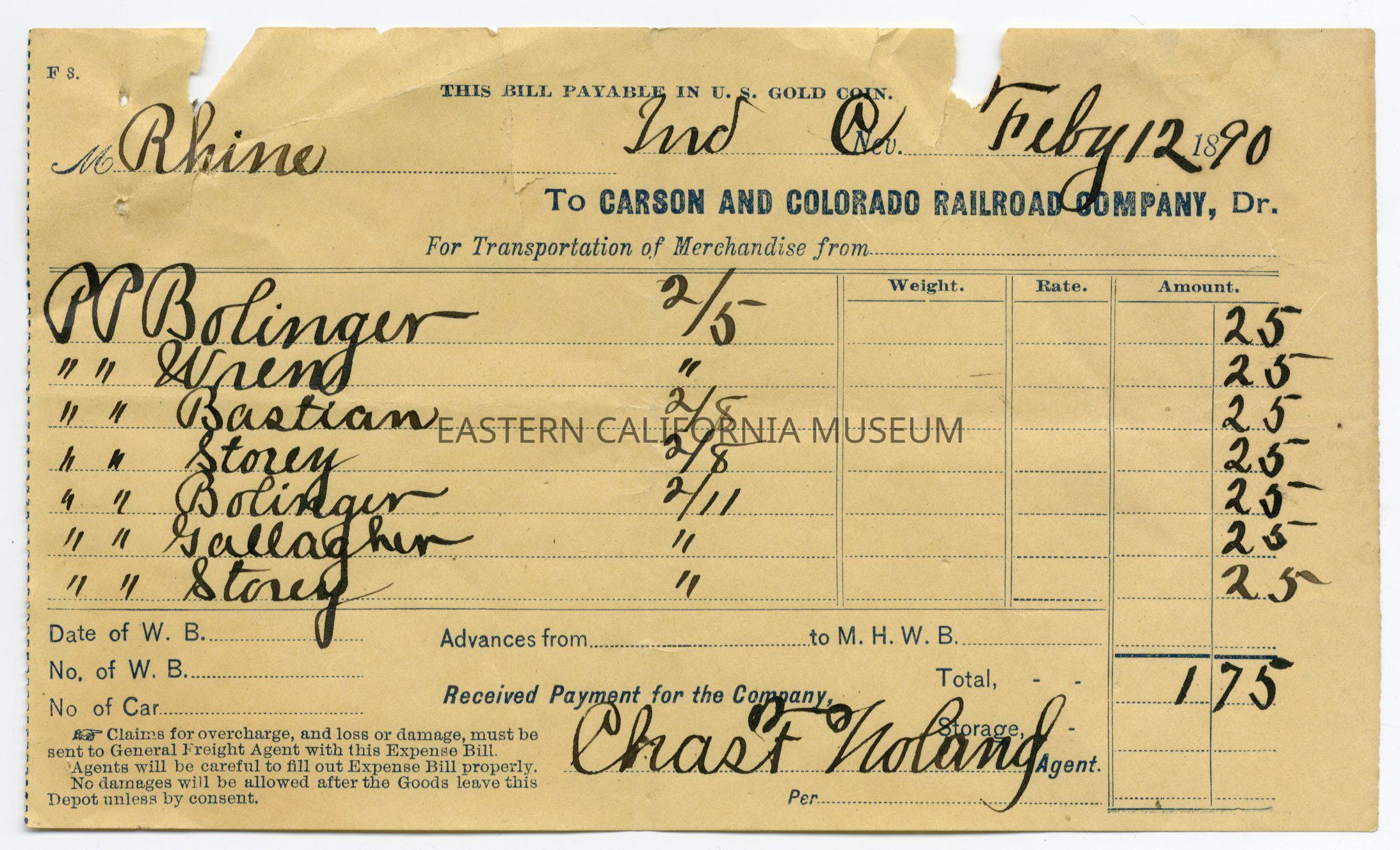 Eleven freight bills sent to Nathan Rhine in Independence by the Carson and Colorado Railroad Company from Mound House in February 1890 for various articles. The paid bills were signed by Chas. F. Noland, Agent.