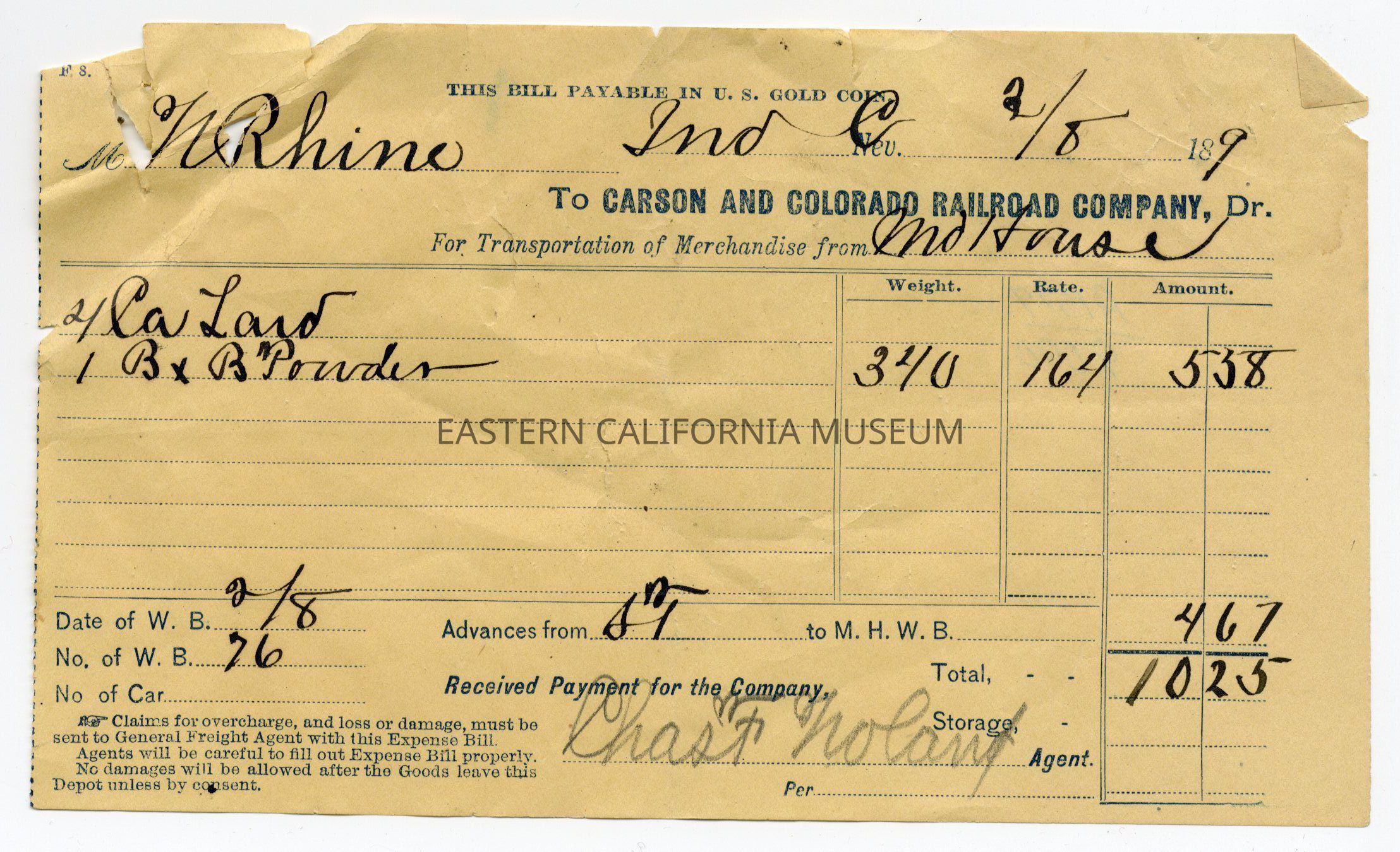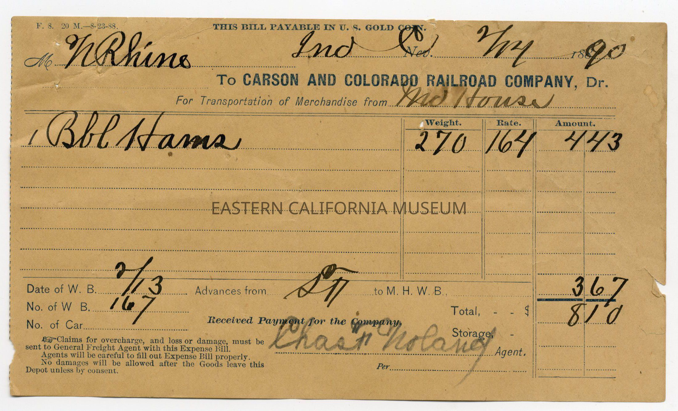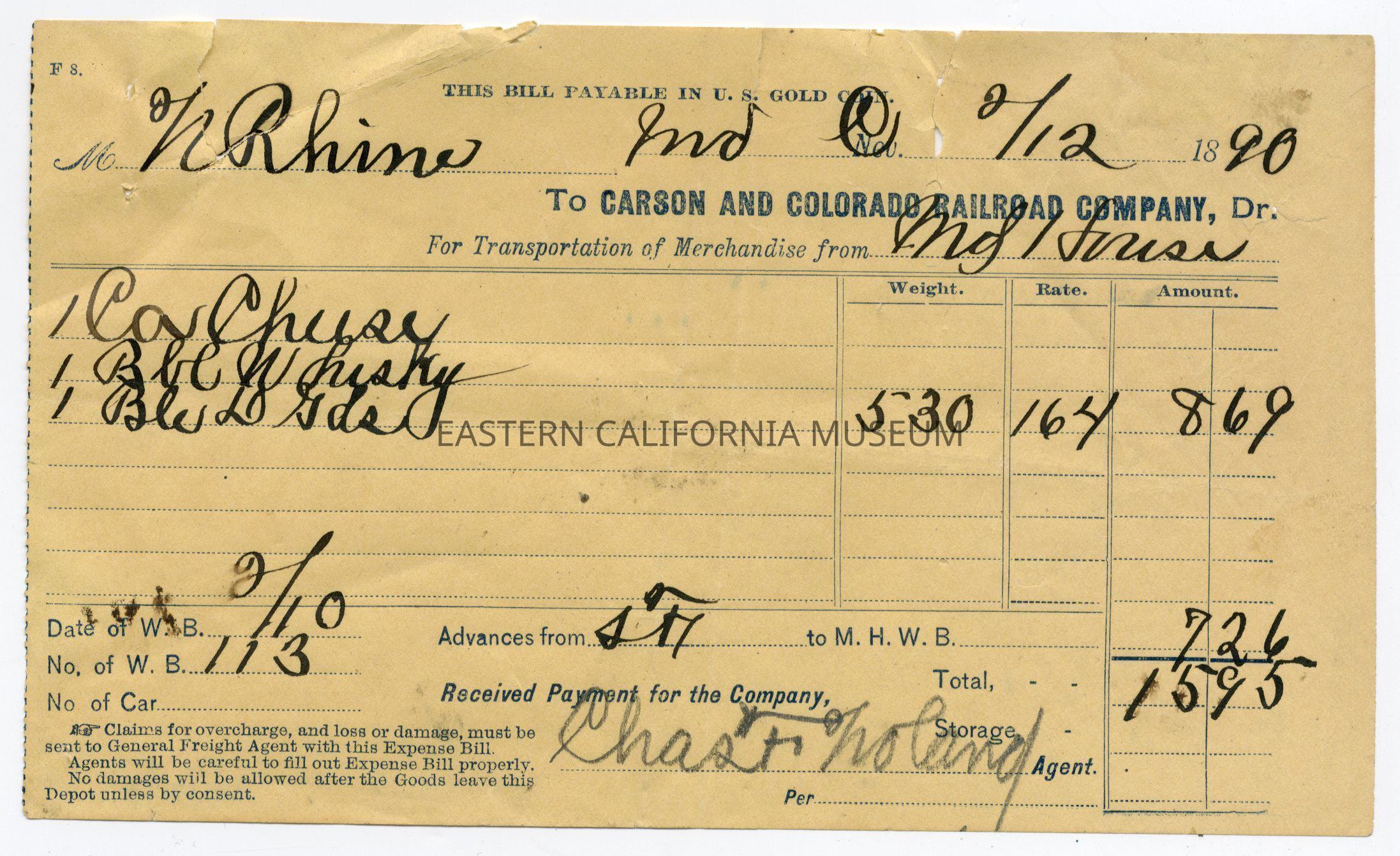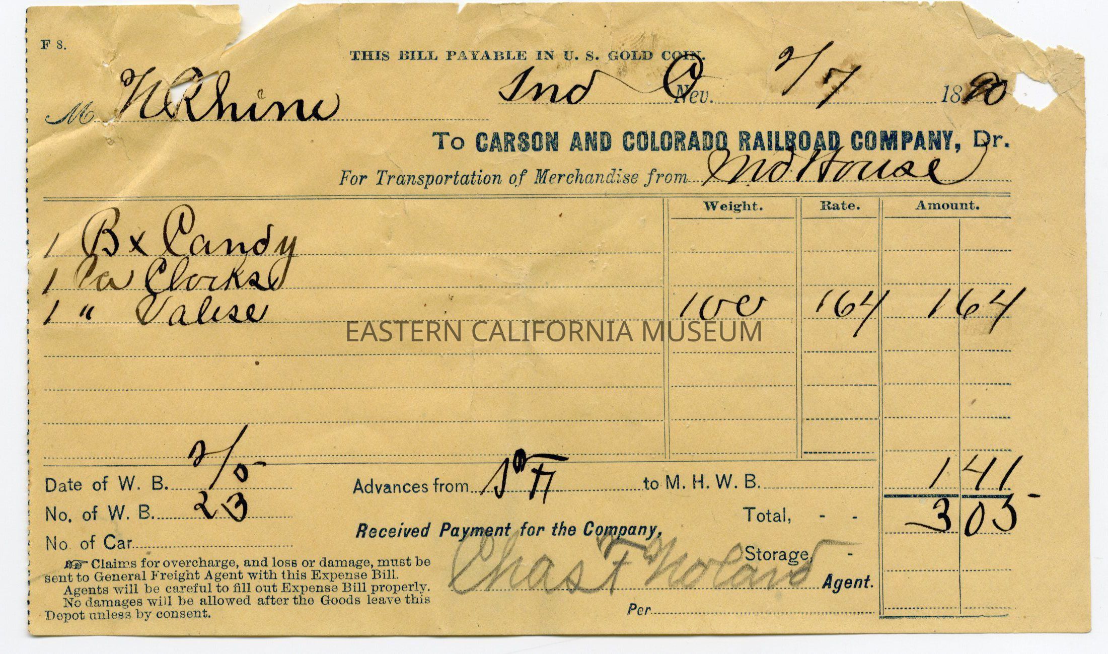 Eleven freight bills sent to Nathan Rhine in Independence by the Carson and Colorado Railroad Company from Mound House in February 1890 for various articles. The paid bills were signed by Chas. F. Noland, Agent.
