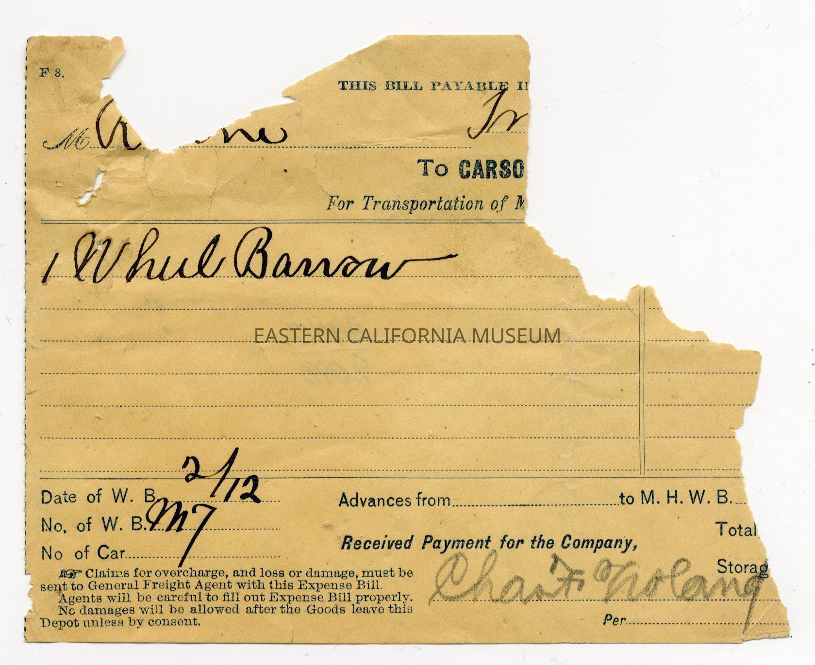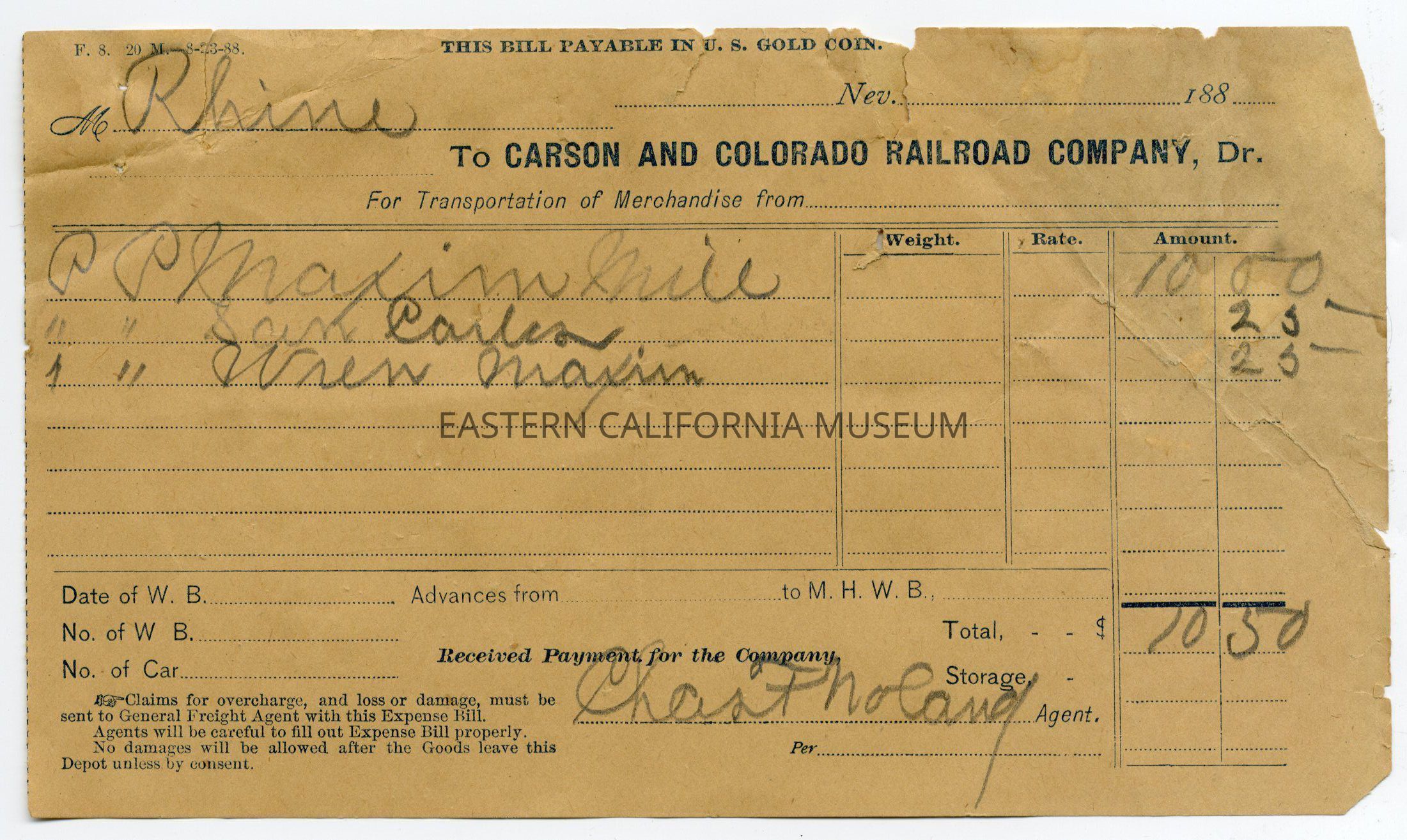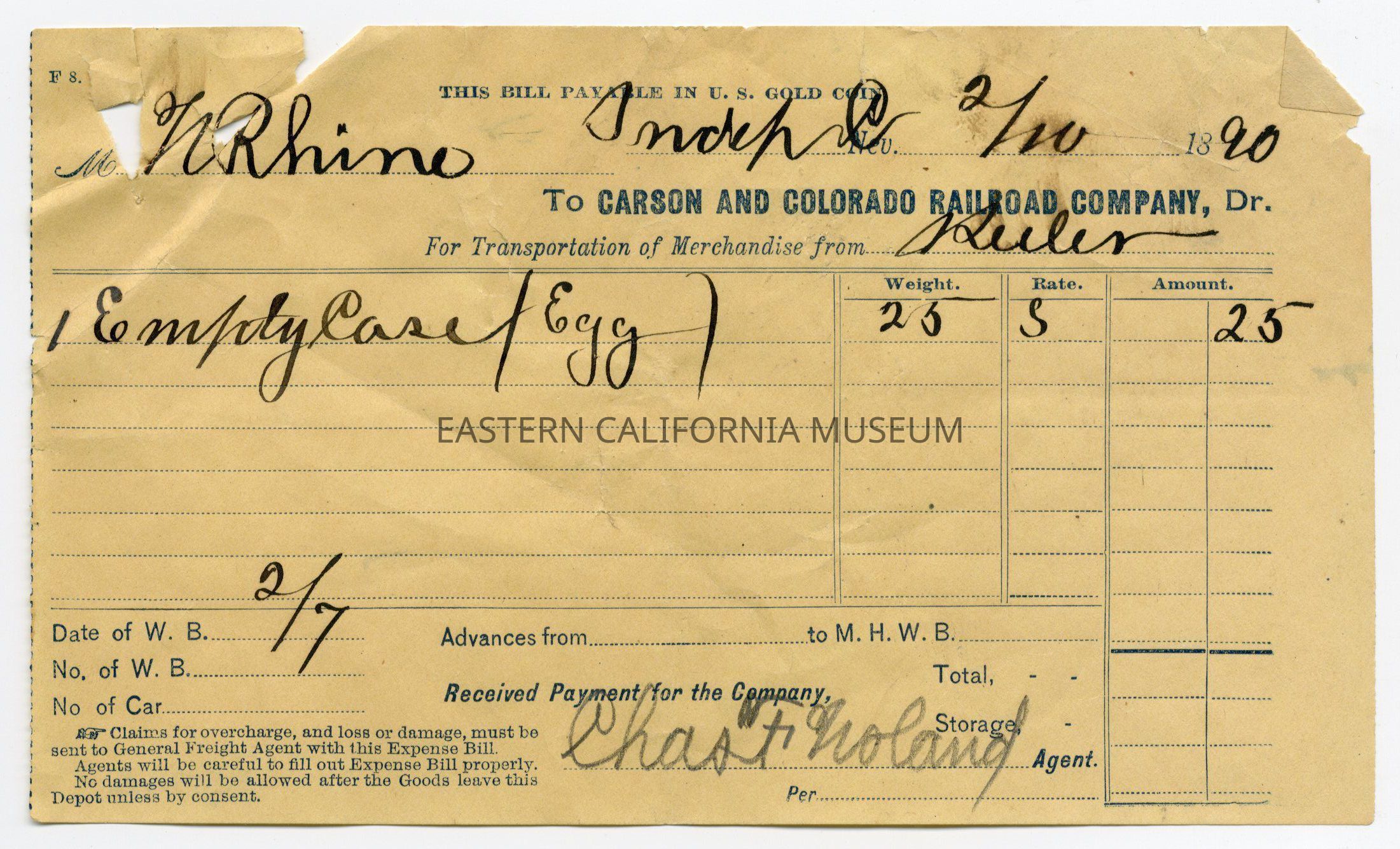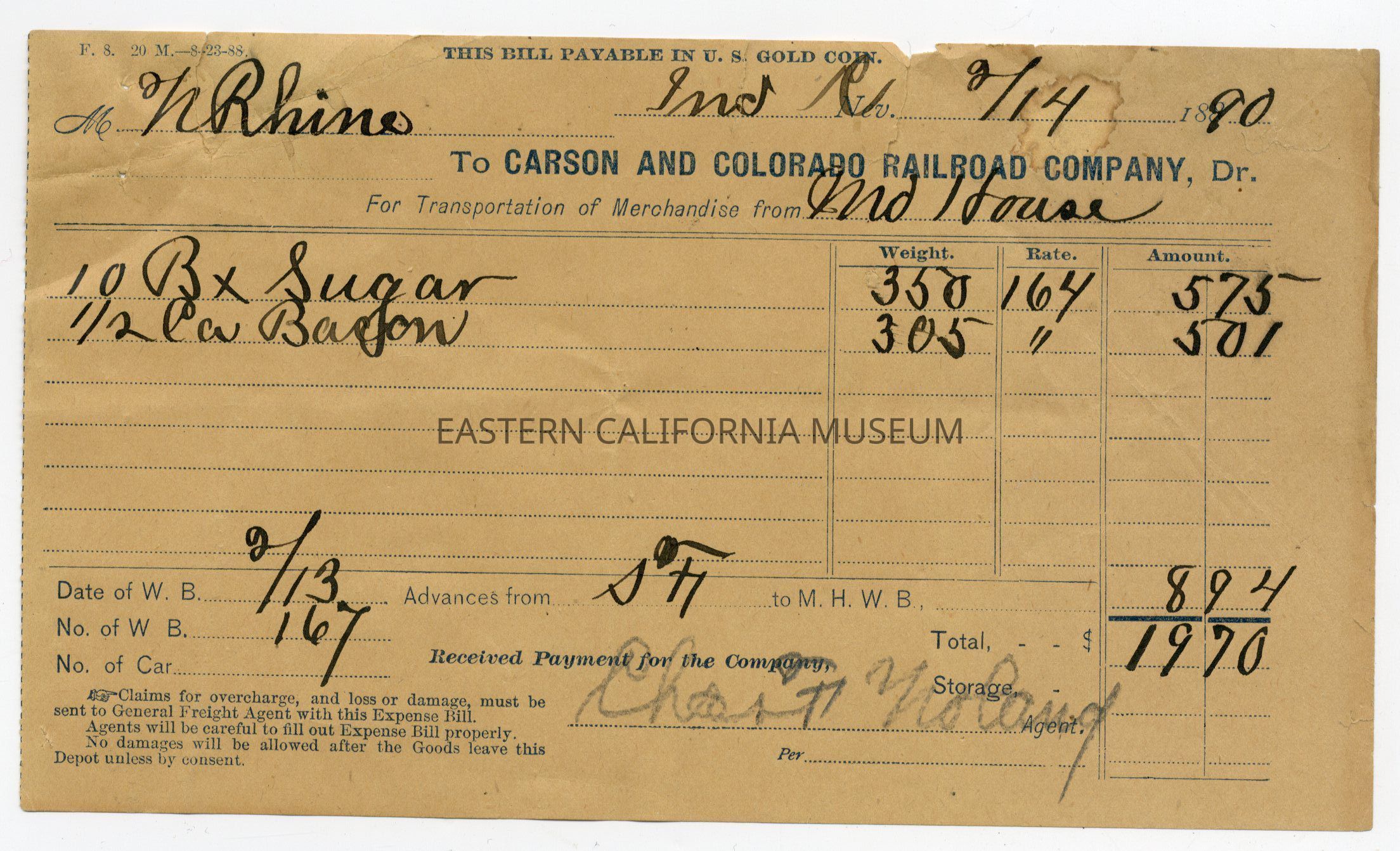 Eleven freight bills sent to Nathan Rhine in Independence by the Carson and Colorado Railroad Company from Mound House in February 1890 for various articles. The paid bills were signed by Chas. F. Noland, Agent.