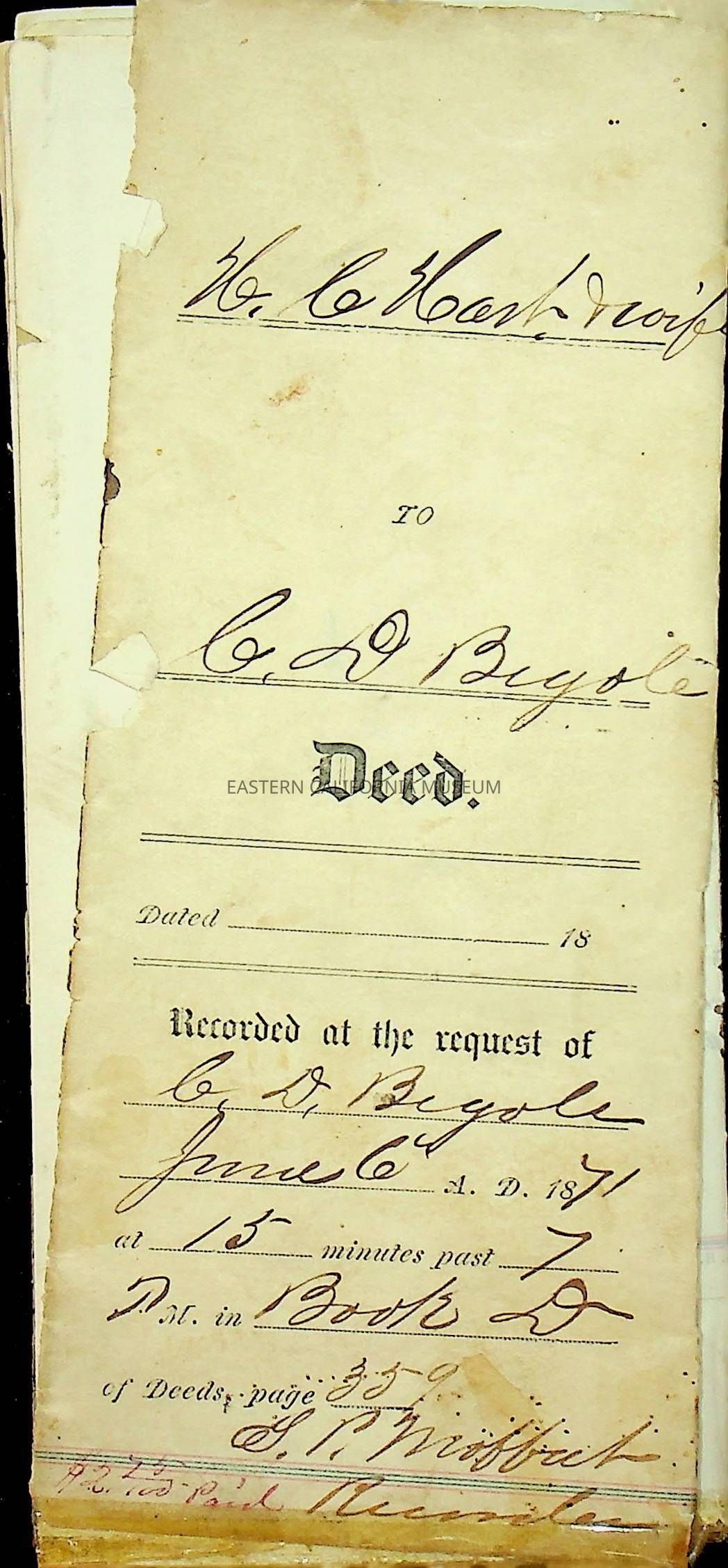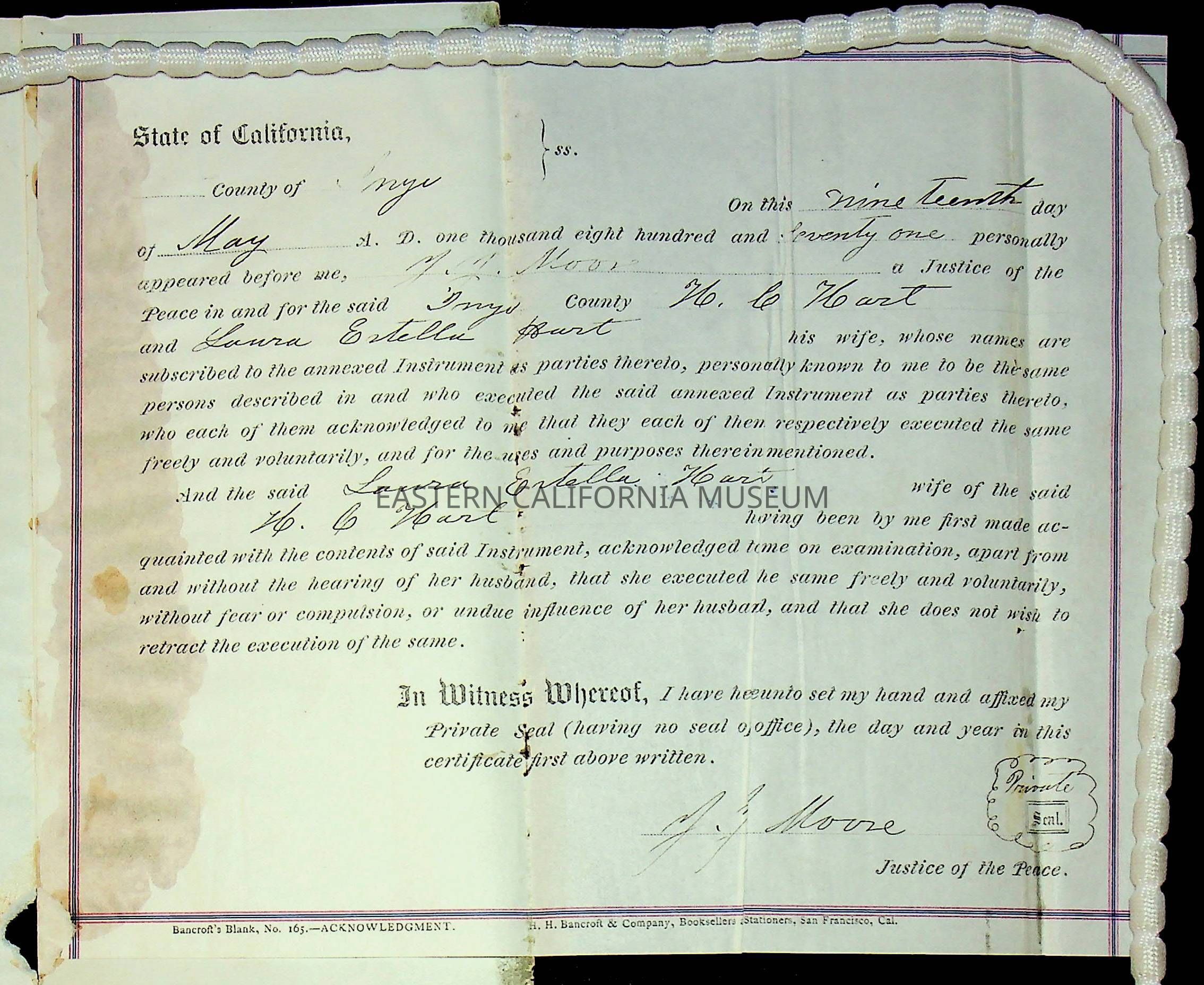 Deed from Lone Pine dated May 17, 1871. It is made out to Henry C. Hart, Laura Estella Hart, and Charles D. Begole. The deed was for the 1959 location of Nadine's on Main St.