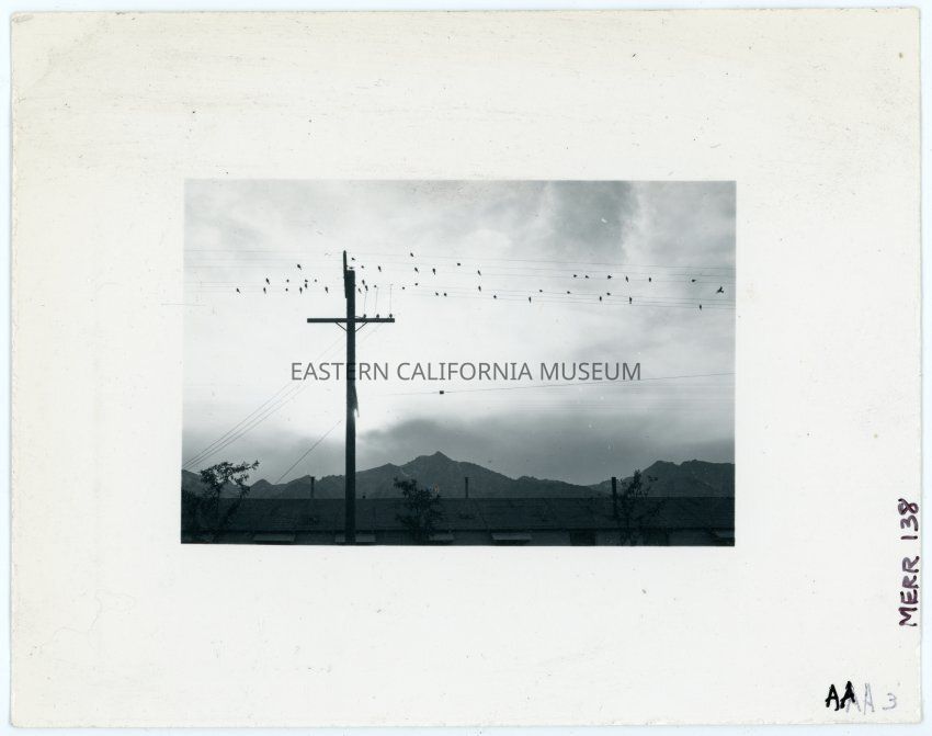 Summary from Library of Congress: "Birds sit on power lines above buildings, mountains and setting sun in the background"