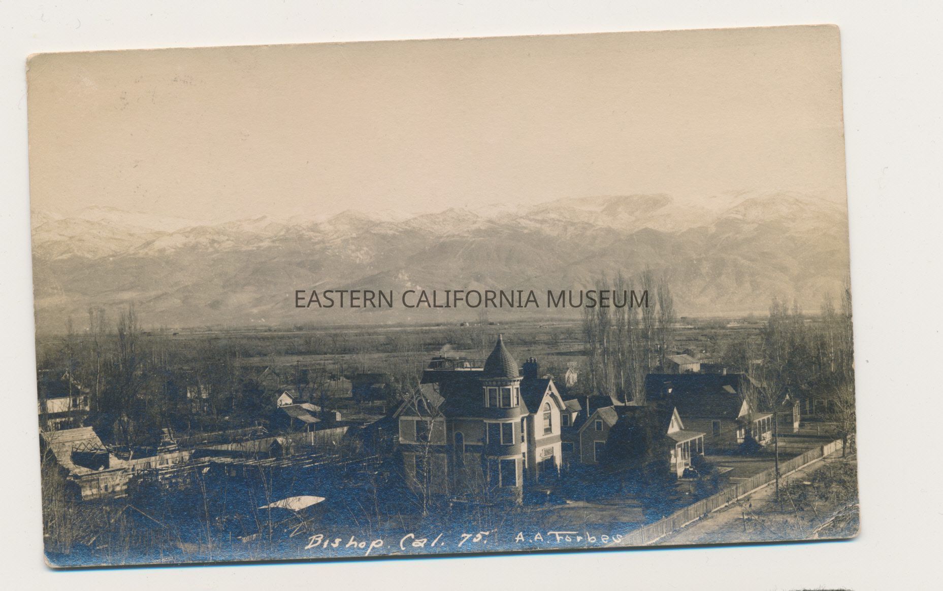 Photo postcard titled "Bishop, Cal." taken by photographer A. A. Forbes and given his ID #75. It it taken from a high vantage point looking towards the snow-capped mountains beyond the town of Bishop. The ornate house in the center may be the Bulpitt house. Possibly taken circa 1911.