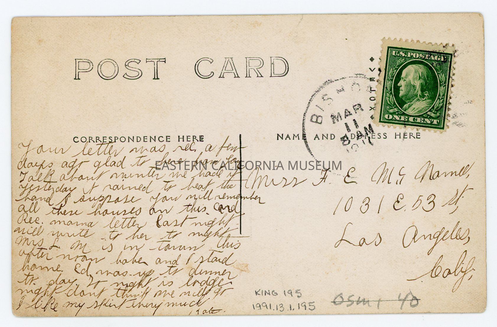 The postcard was mailed from Bishop on March 11 [year illegible] and it has a green one cent Benjamin Franklin stamp. It was sent to Miss F. E. McNamel [sp?] in Los Angeles from Kate.Photograph Details