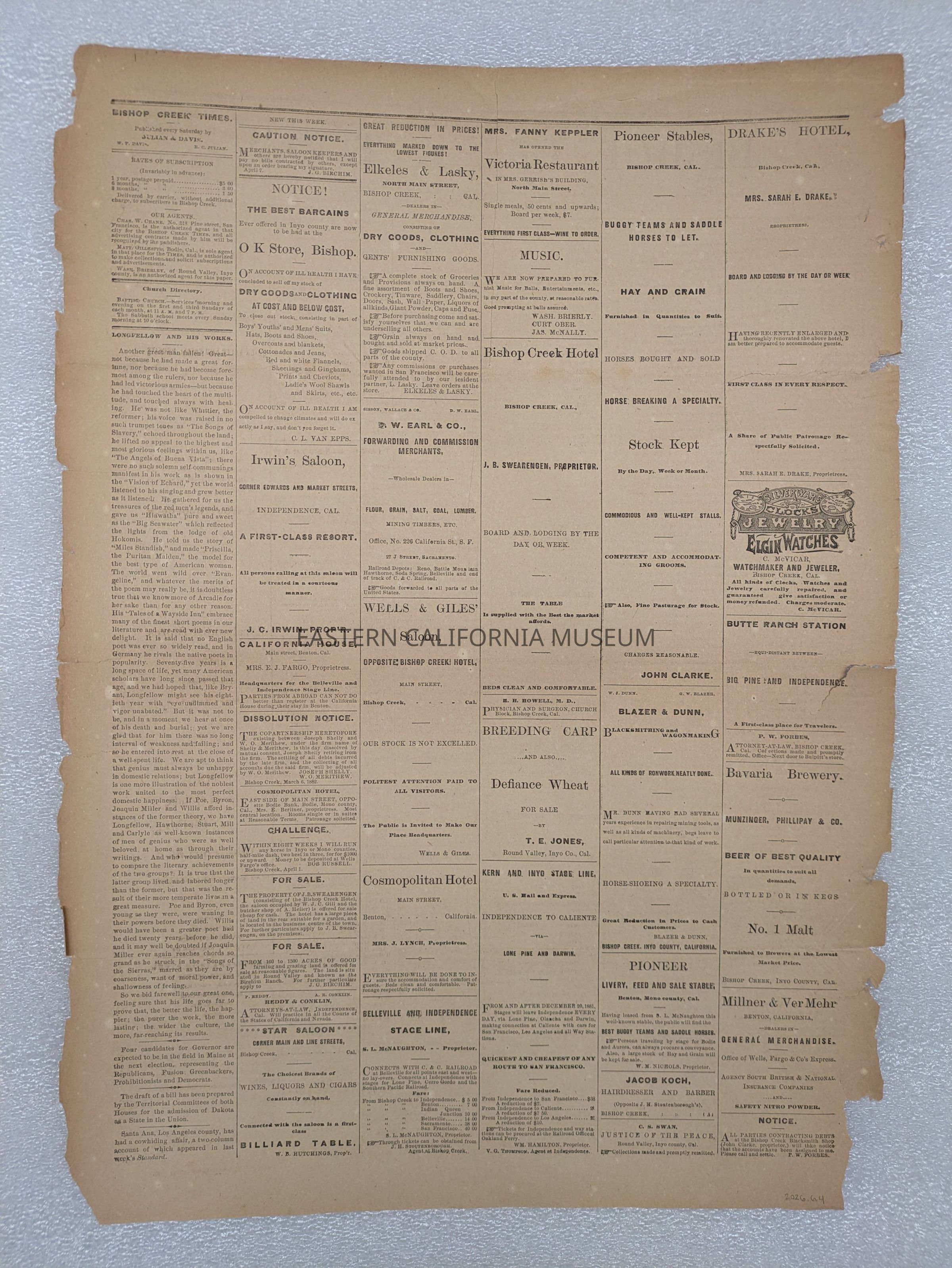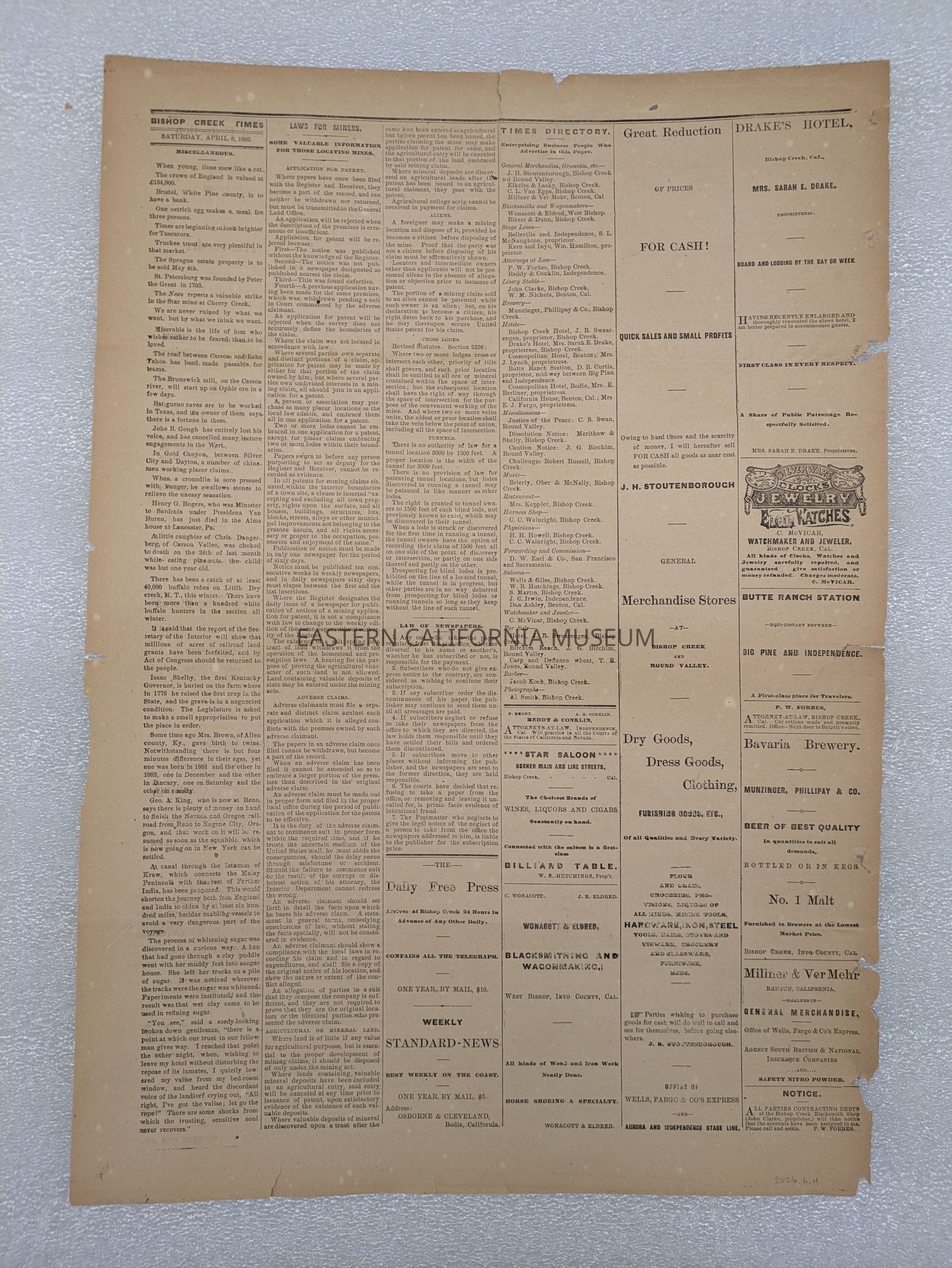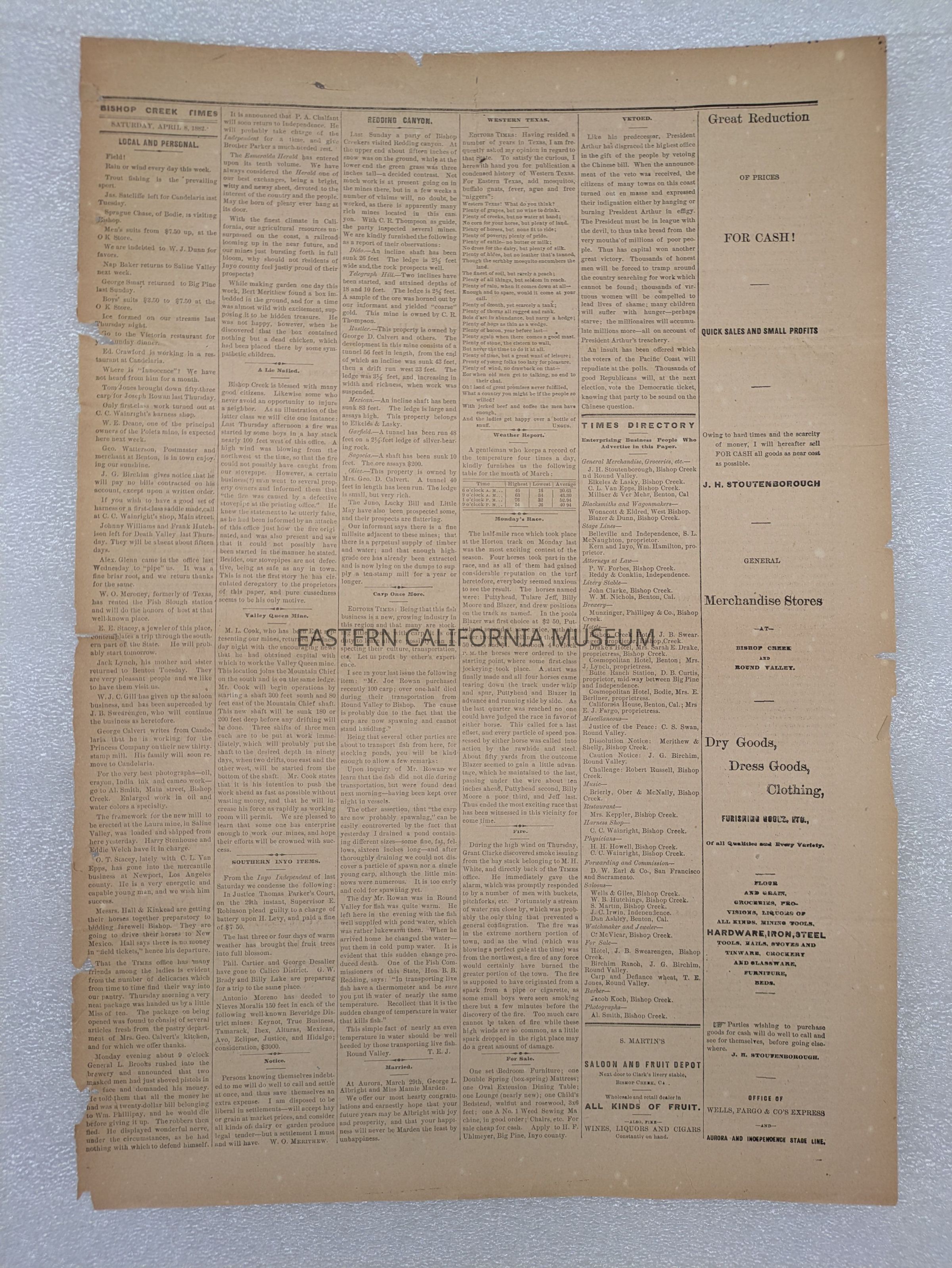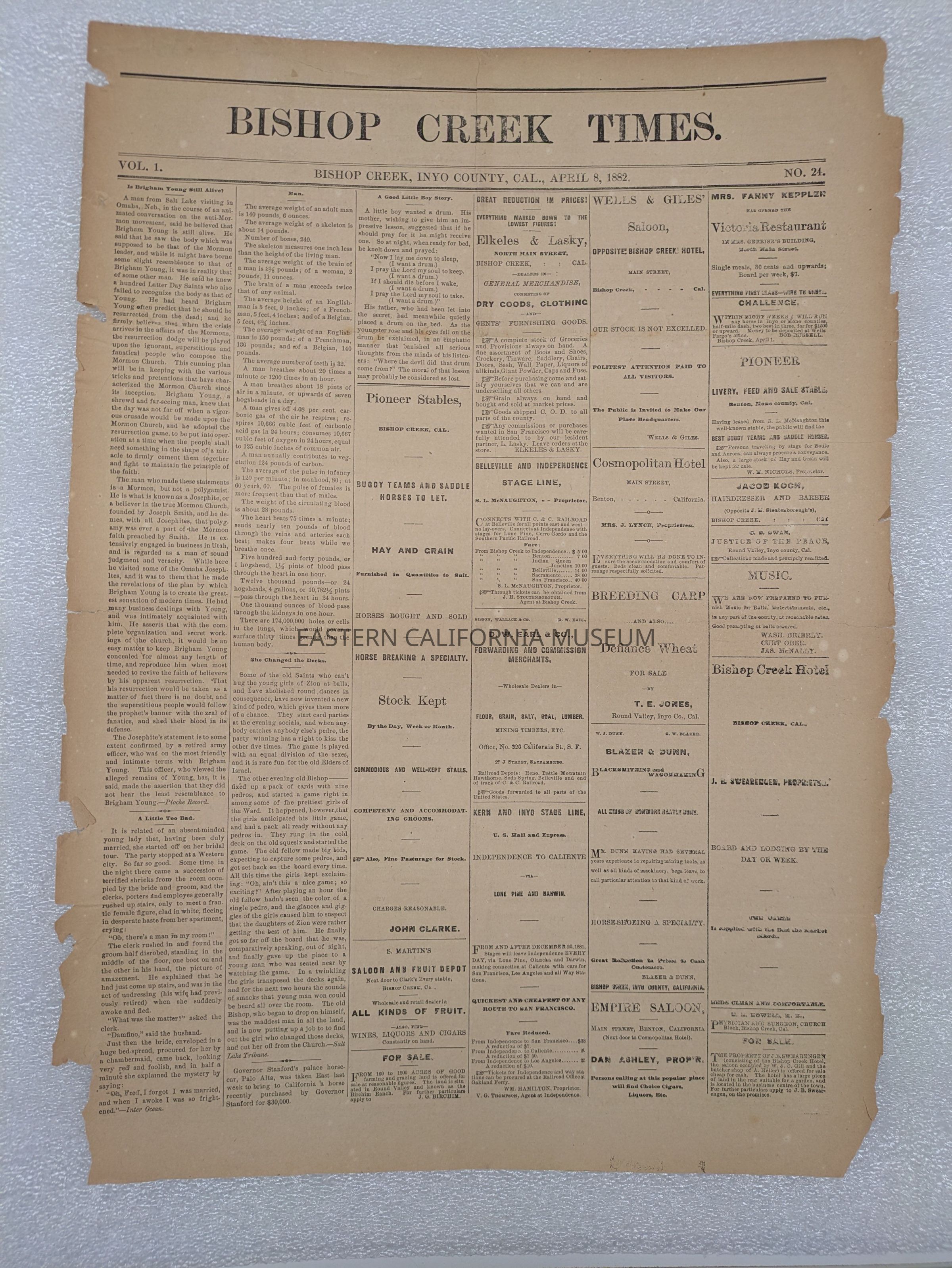 Newspaper: Bishop Creek Times, Vol. 1, No. 24, April 8, 1882.Collection